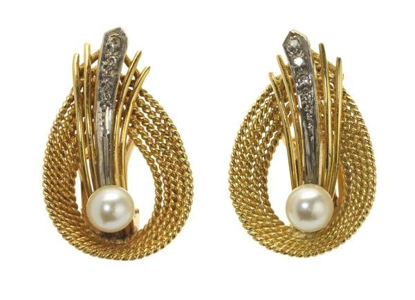 3403. Boucles d'oreilles stylisées à motif tressé centré d'une perle (...
