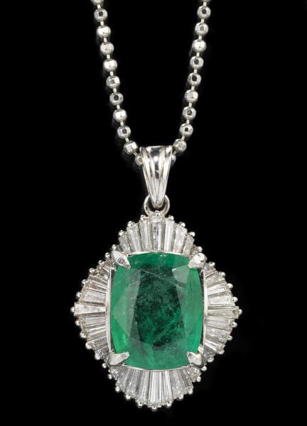 3513. *Chaîne à maille boule retenant un pendentif serti d'une émeraud...