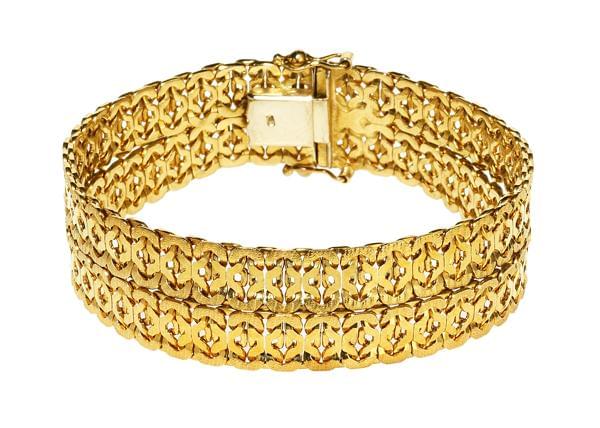 3526. Bracelet composé de motifs trois ors en tourbillons stylisés