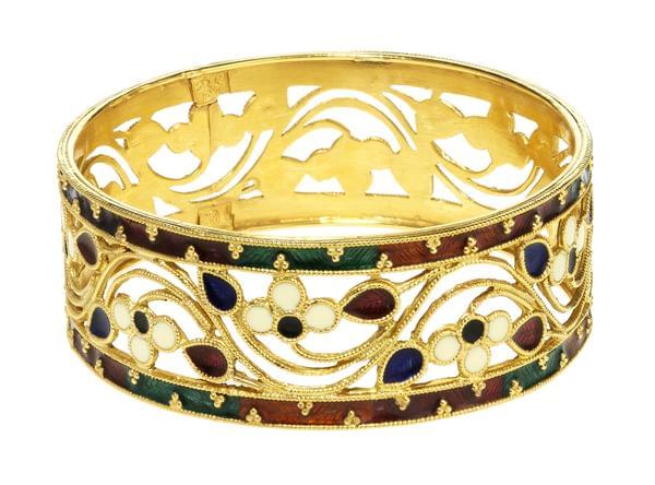 3562. Bracelet manchette rigide émaillé et ajouré à décor floral