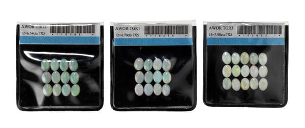 3642. Ensemble de trois lots d'opales taille cabochon ovale sur papier