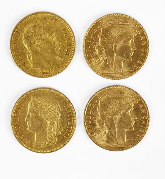 3679. Lot de quatre pièces de 20 francs or comprenant: