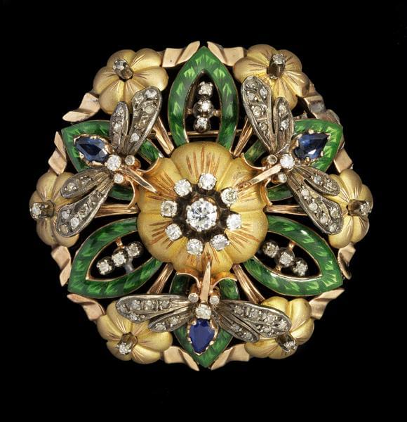 3602. *Broche à motif de fleur ajourée et émaillée vert
