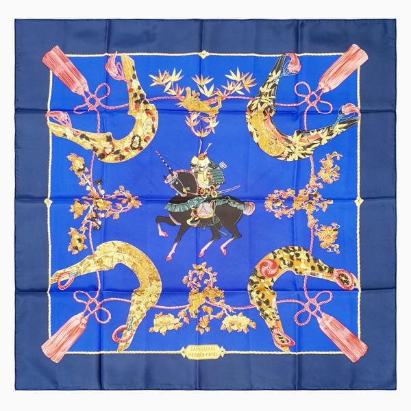 A décor d'un samouraï sur son cheval sur fond bleu et bordure bl...