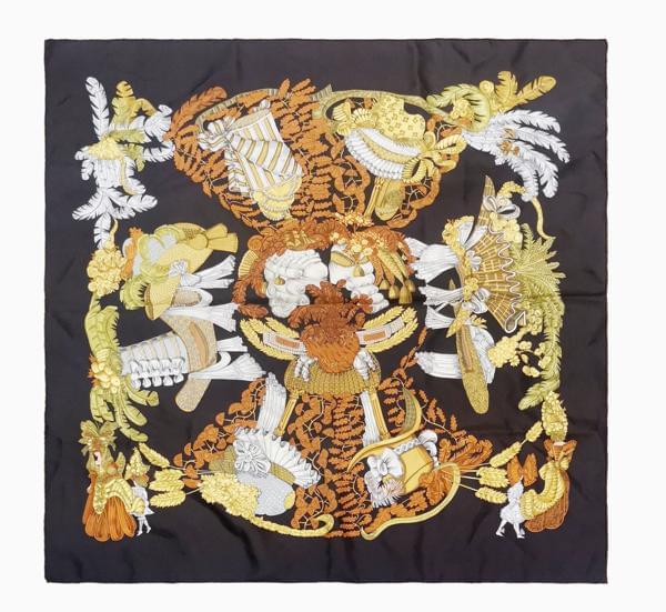 A décor de chapeaux d'apparat sur fond chocolat, soie, 88x88 cm