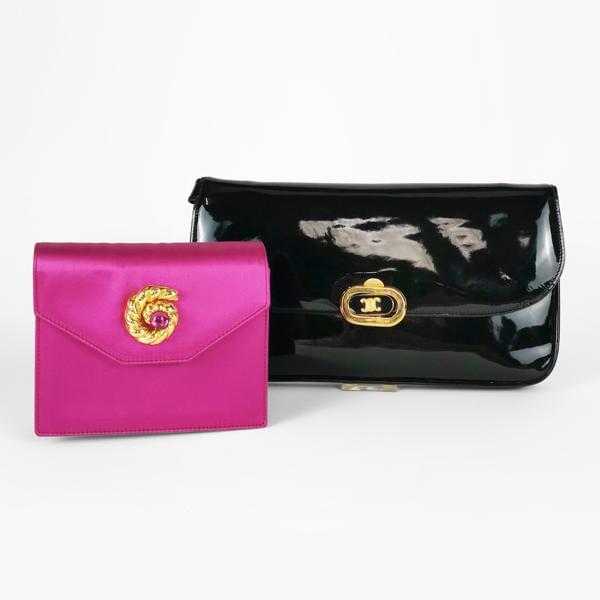 L'une en satin et soie fuchsia, l'autre en cuir verni noir, ferm...