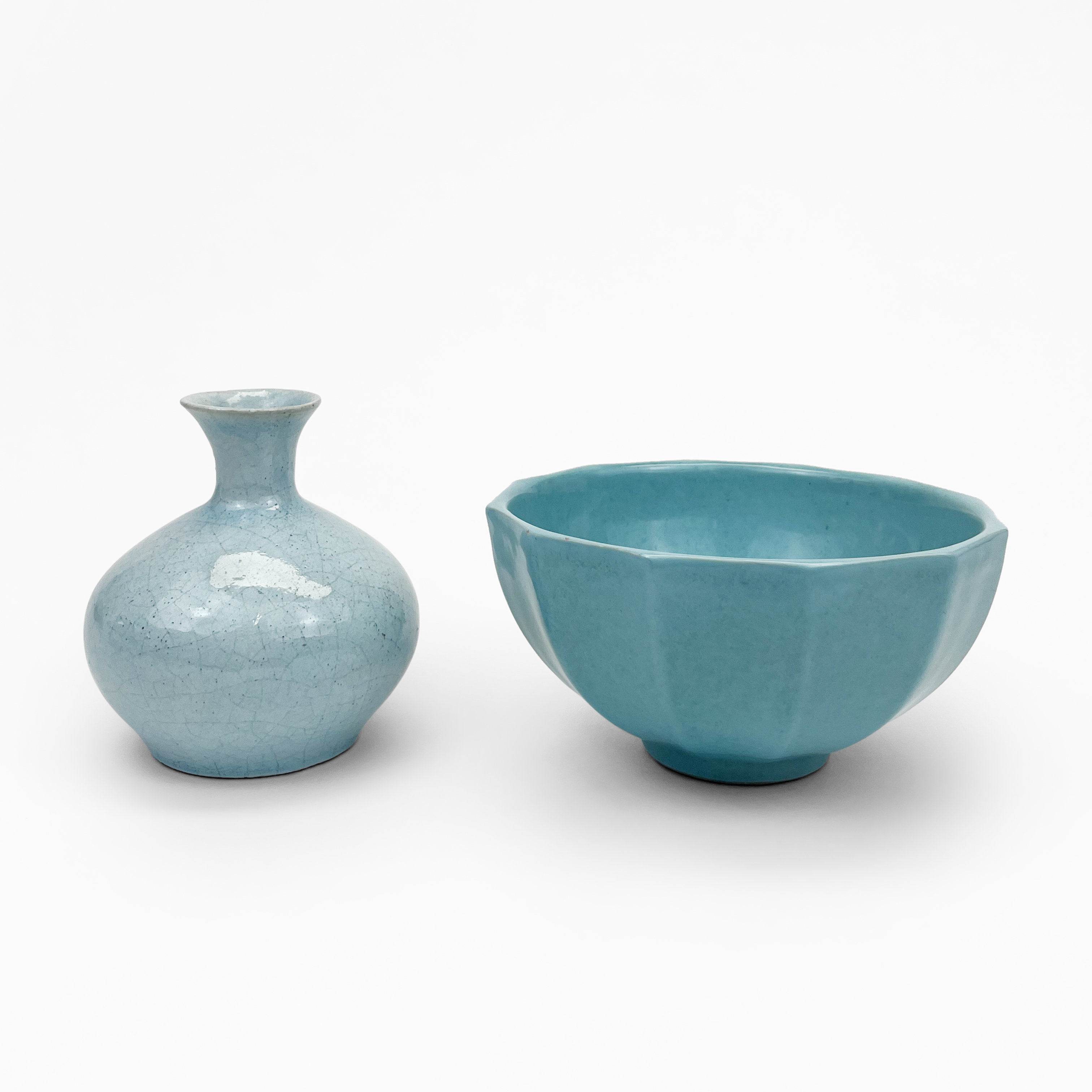 Deux bols cannelés, céramique émaillée vert et bleu claire, sign...