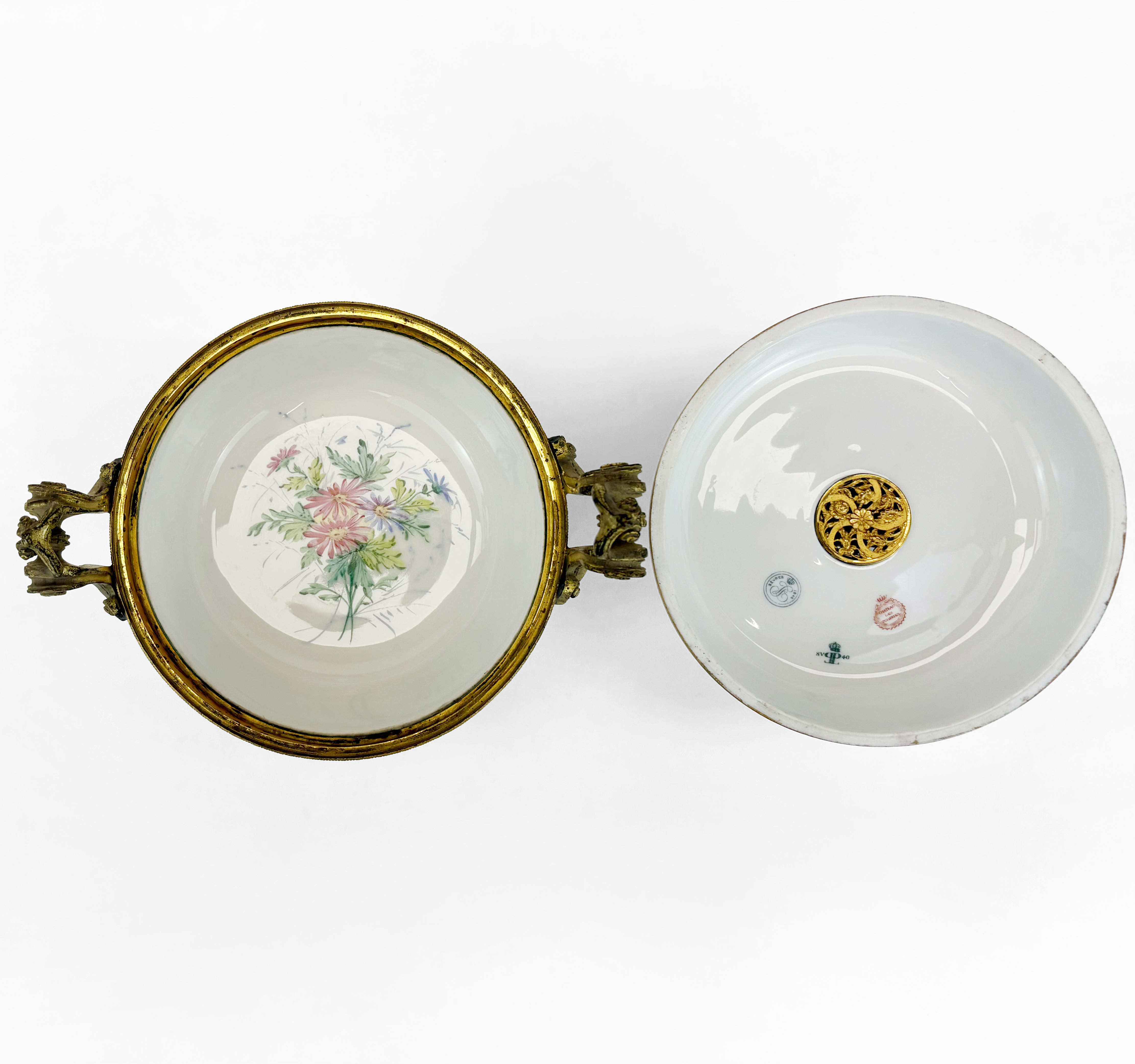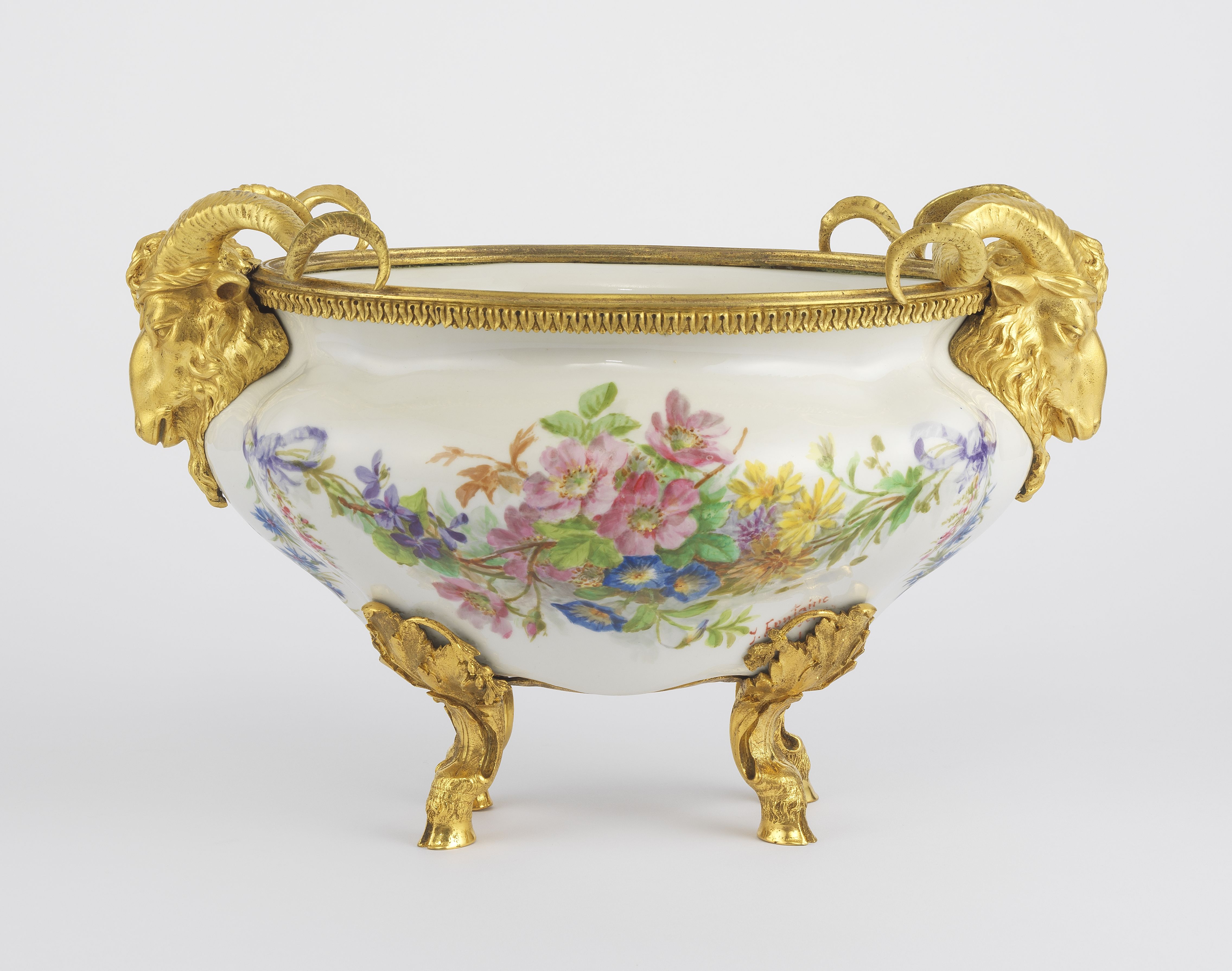 Porcelaine peinte de motifs floraux, monture en bronze doré à dé...