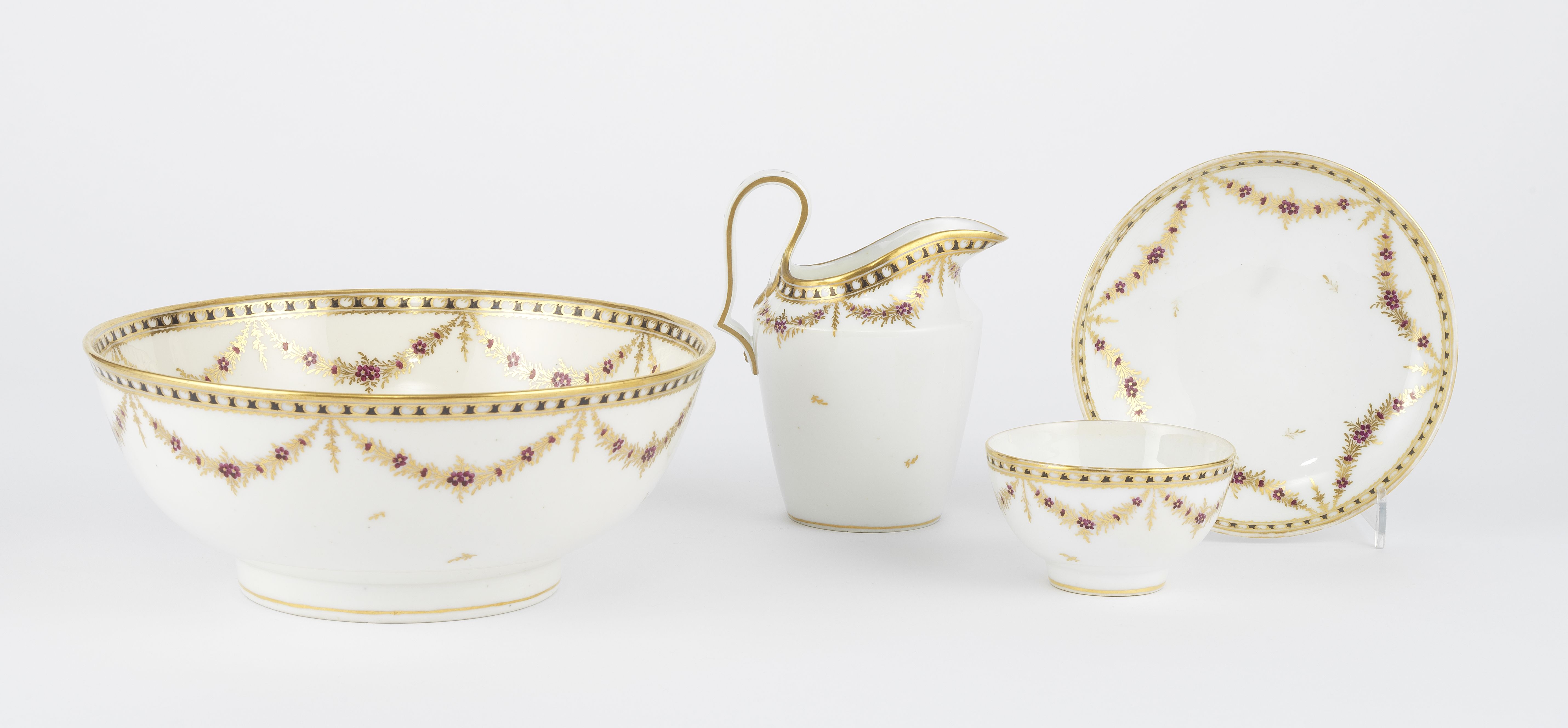 4313. Jatte, verseuse et bol à décor de Reine de Naples