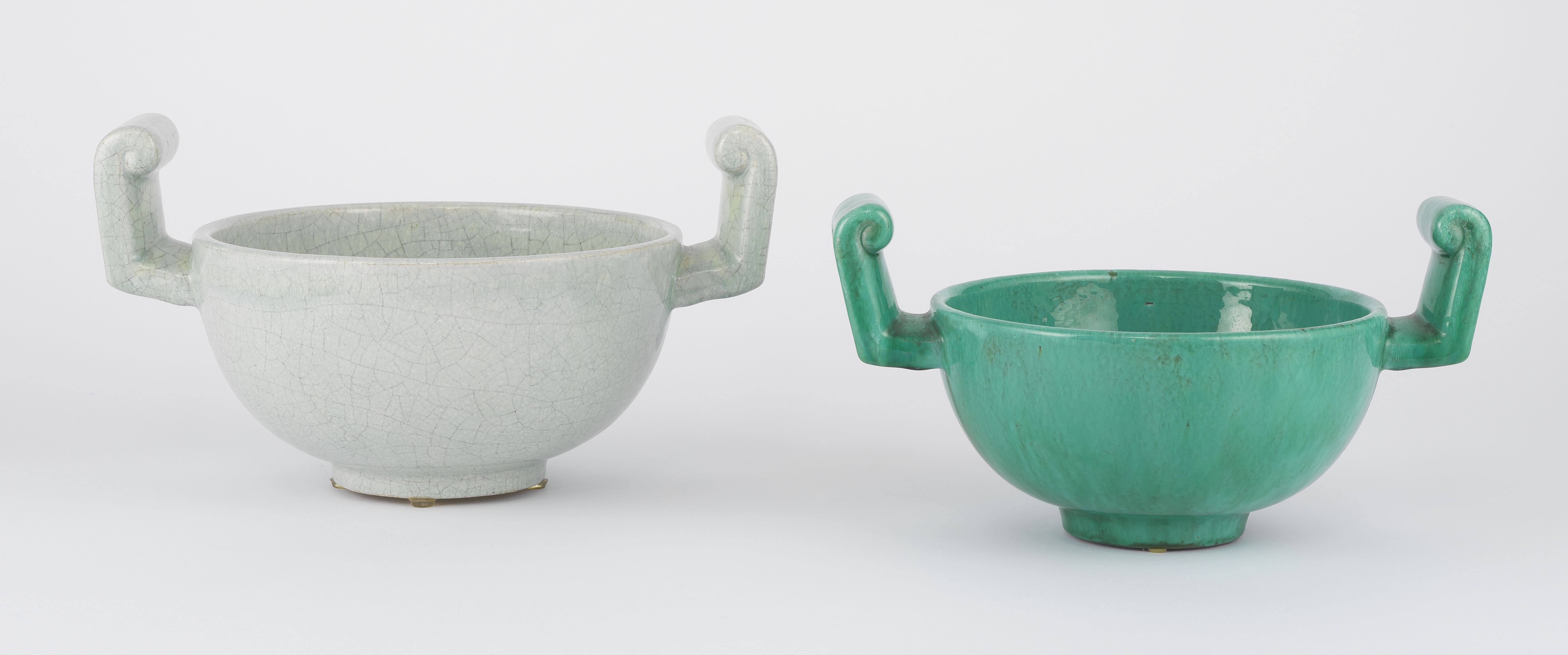 Deux bols à anses, blanc et vert, céramique, l'un numéroté 754,...