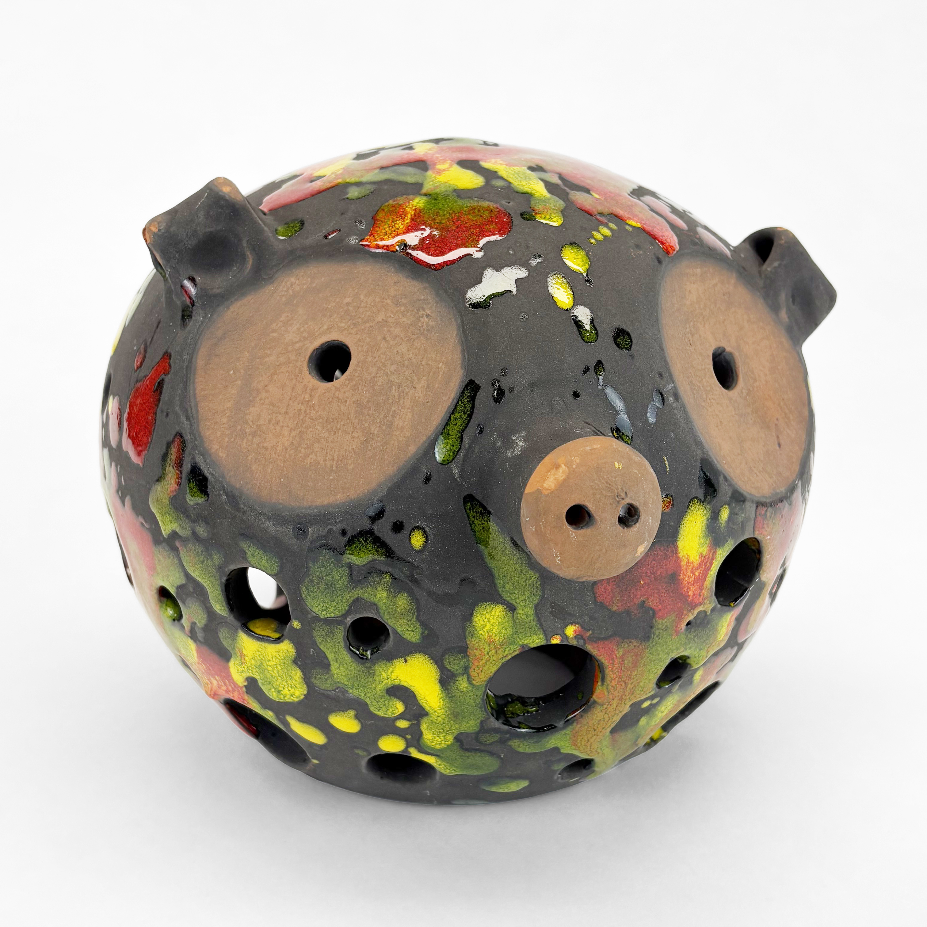 Vase boule sur pied, céramique émaillée brune, jaune et rose à d...