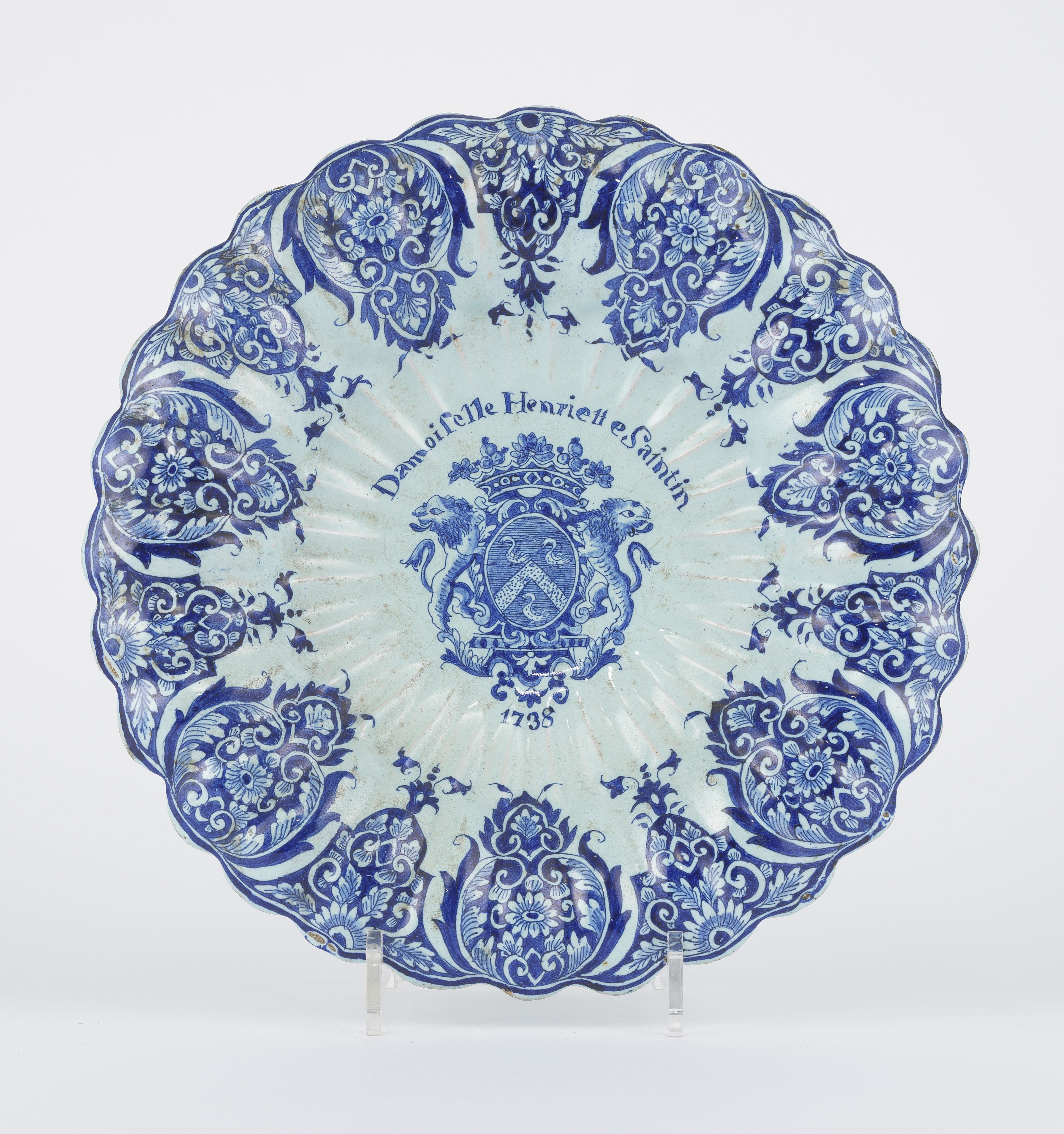 4252. Plat armorié, Rouen, marqué Damoiselle Henriette Saintain et dat...