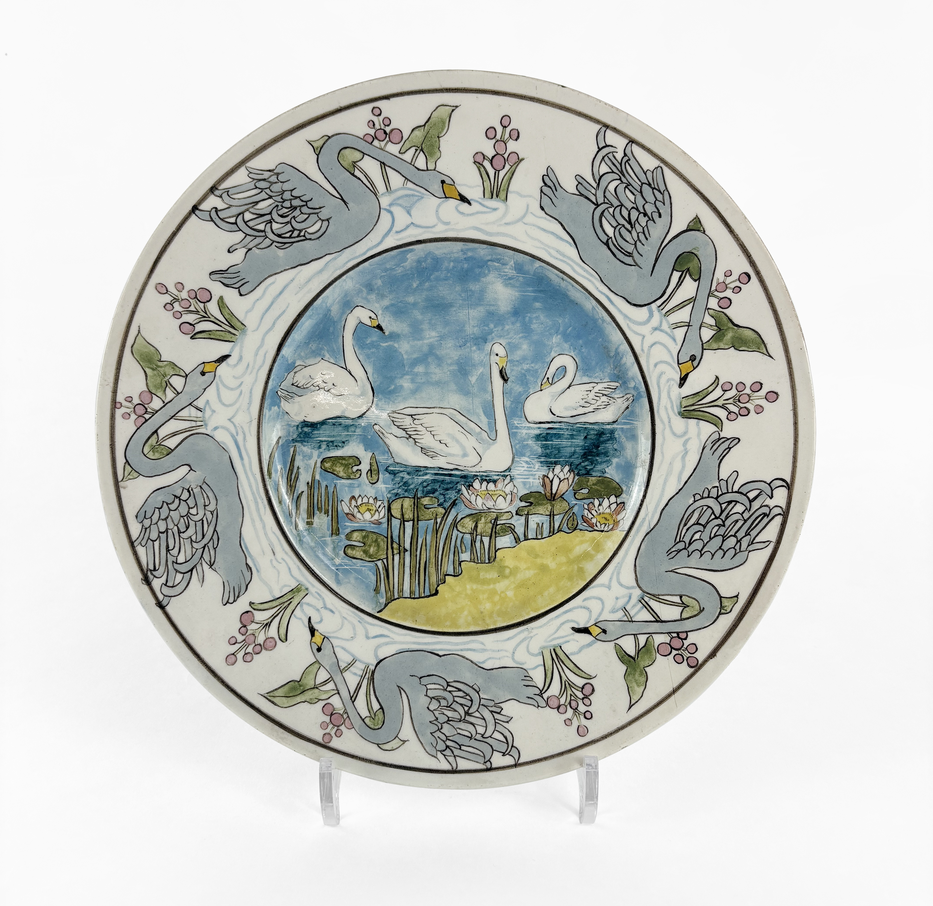 Faïence émaillée polychrome à décor de cygnes, D 27 cm. Provenan...