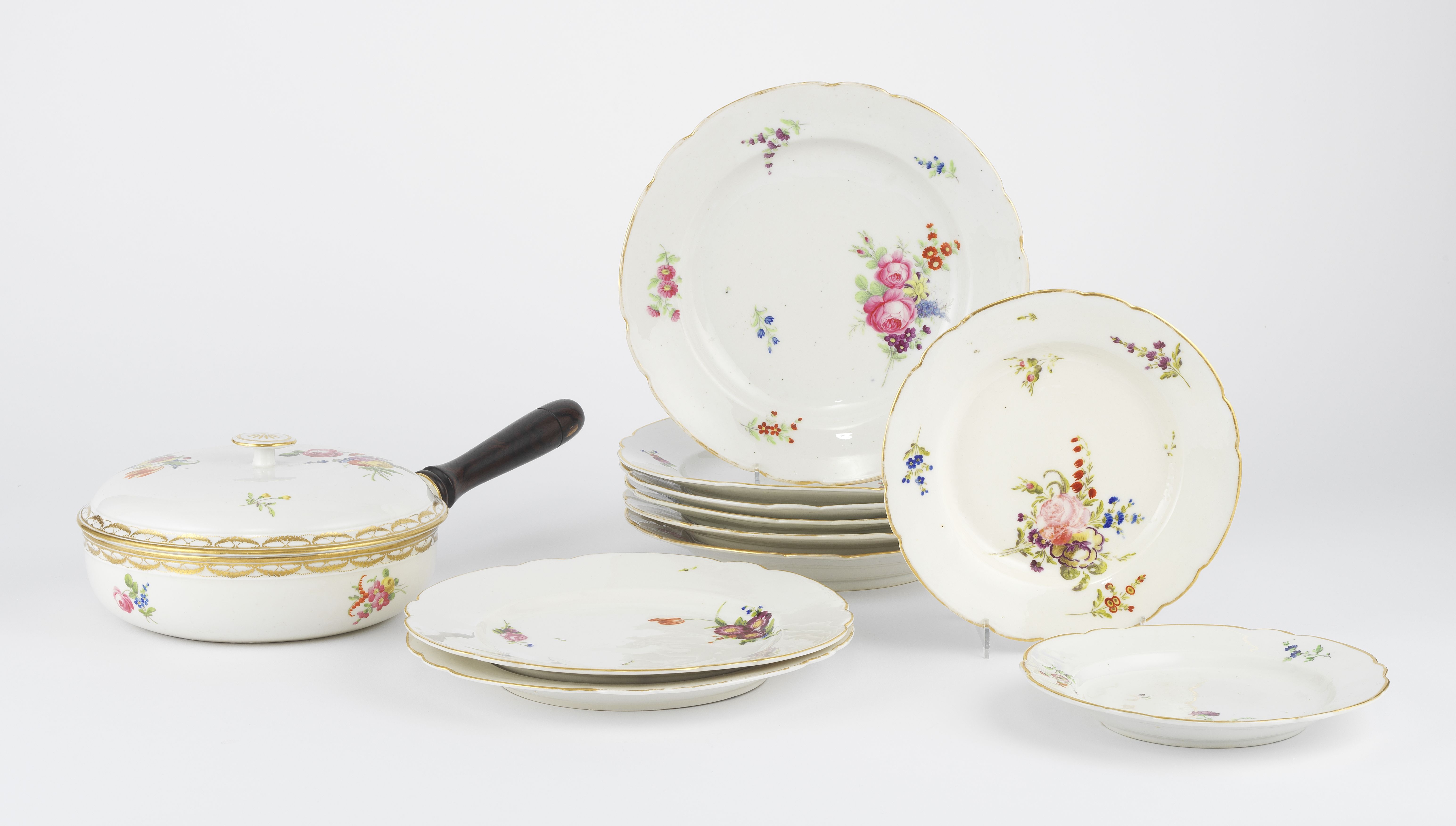 4310. Suite de 10 assiettes et un poêlon à motif de bouquets de fleurs