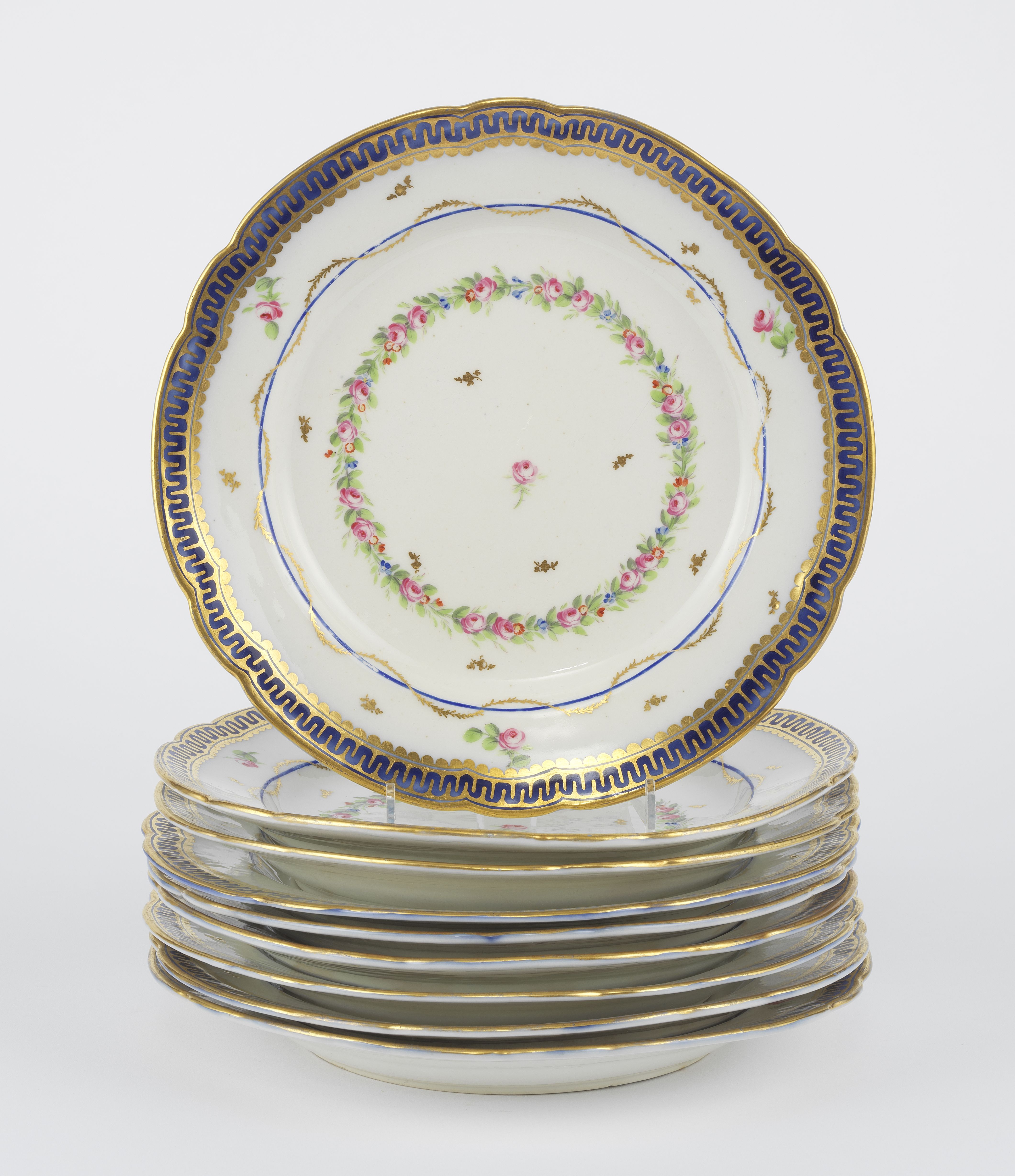 4311. Suite de 9 assiettes à décor de guirlandes de fleurs réhaussées...