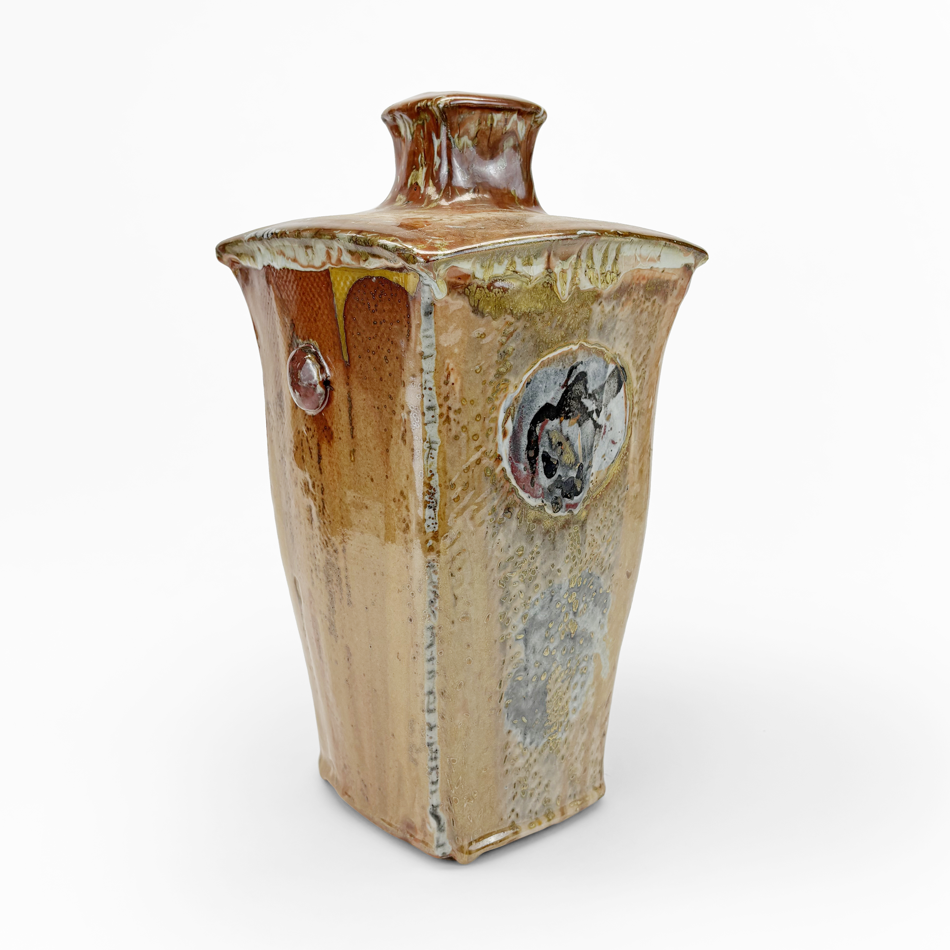 Vase moderniste à section carrée, grès émaillé brun et gris, sig...