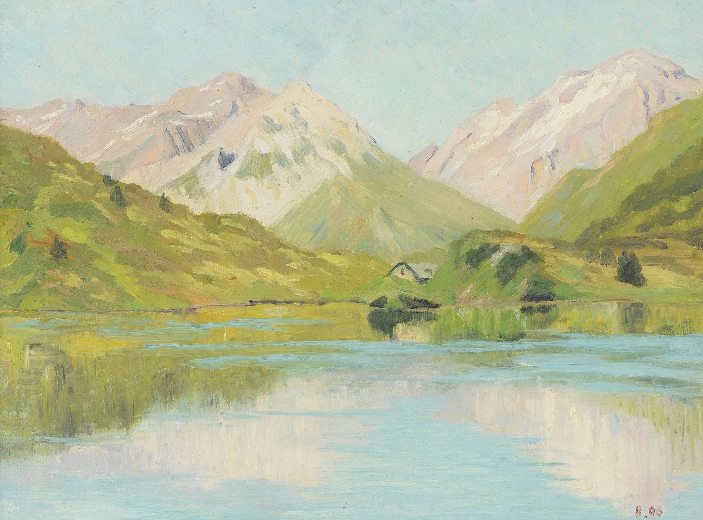 Paysage lacustre, huile sur toile, 47x72 cm