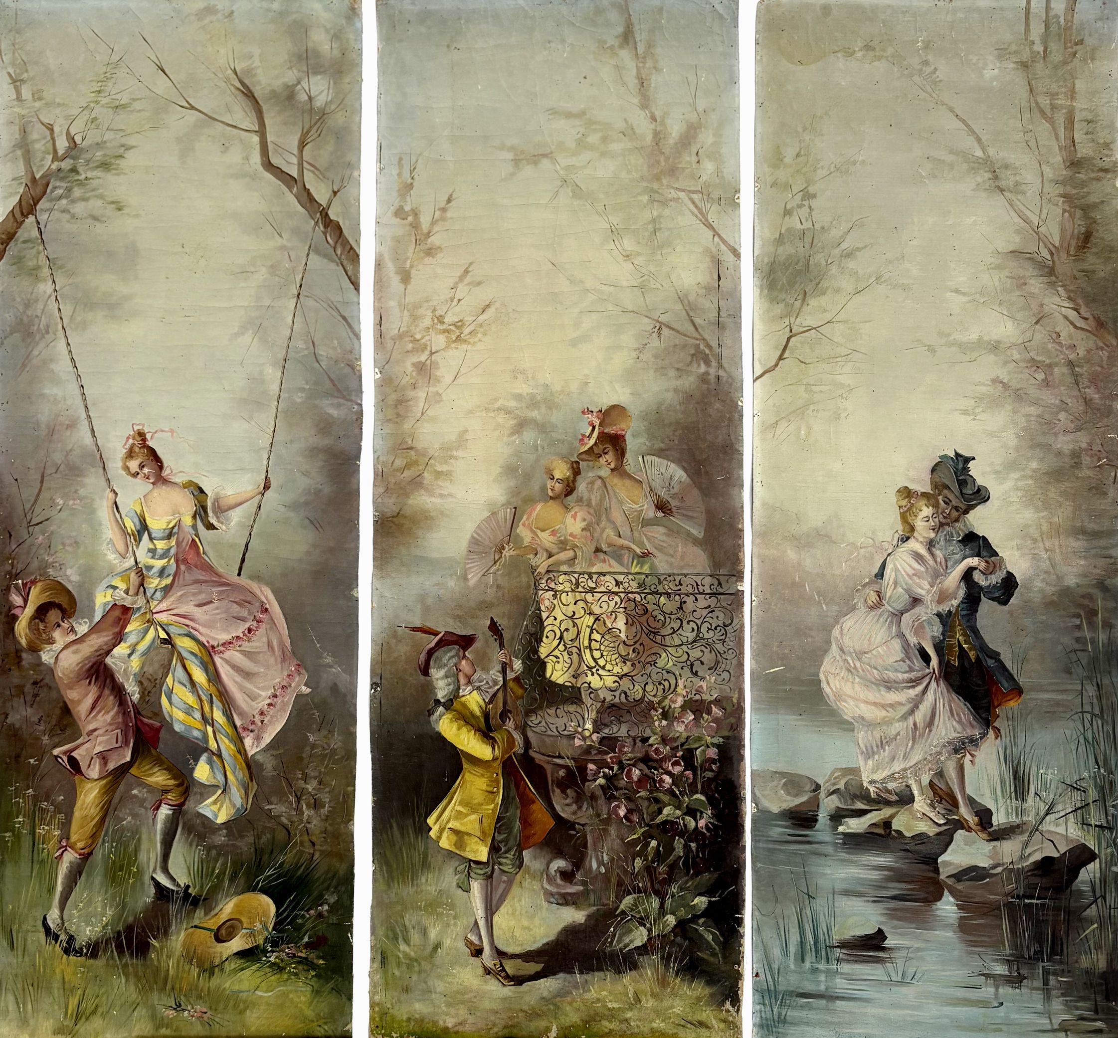 Trois toiles peintes à sujet galant, huile sur toile, 112x38 cm