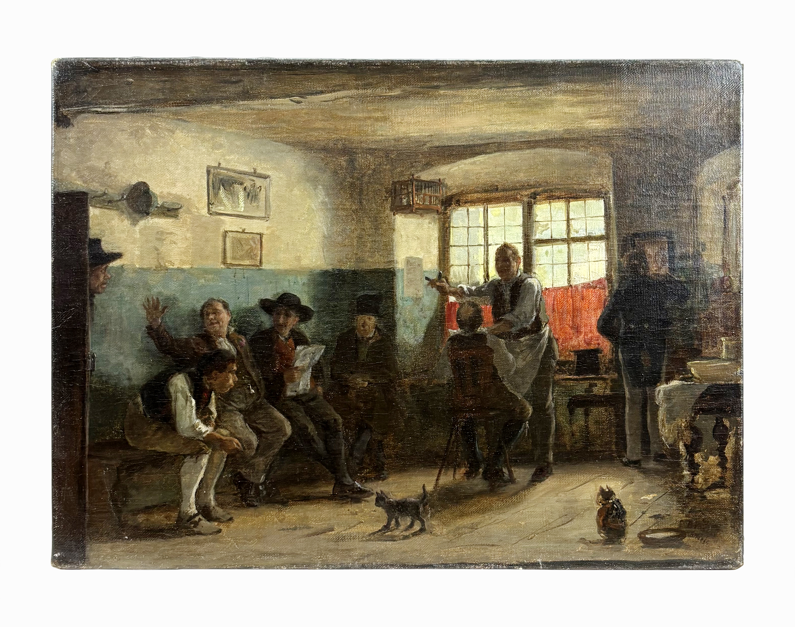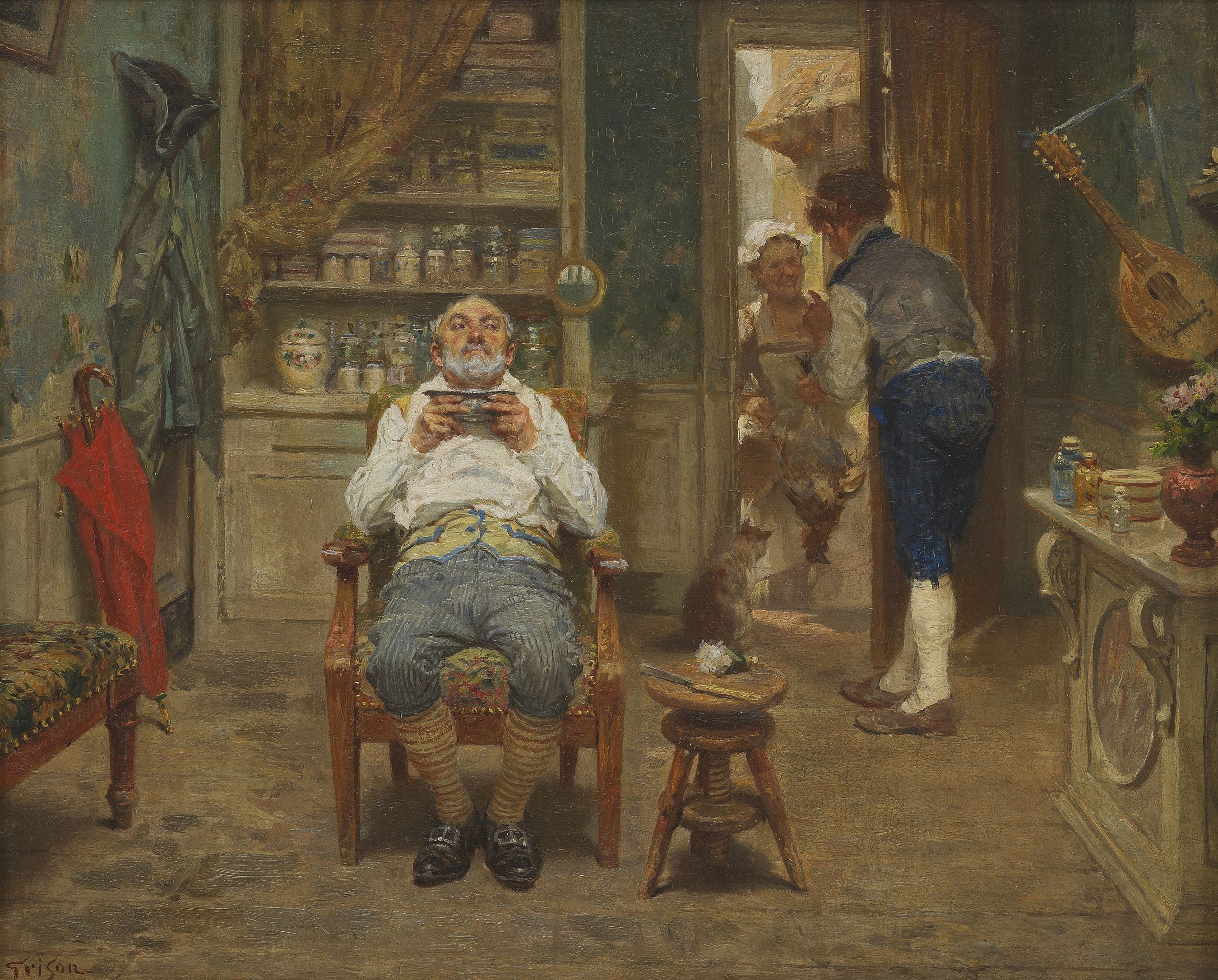 Imprévu chez le barbier, huile sur toile, signée, 33x44 cm