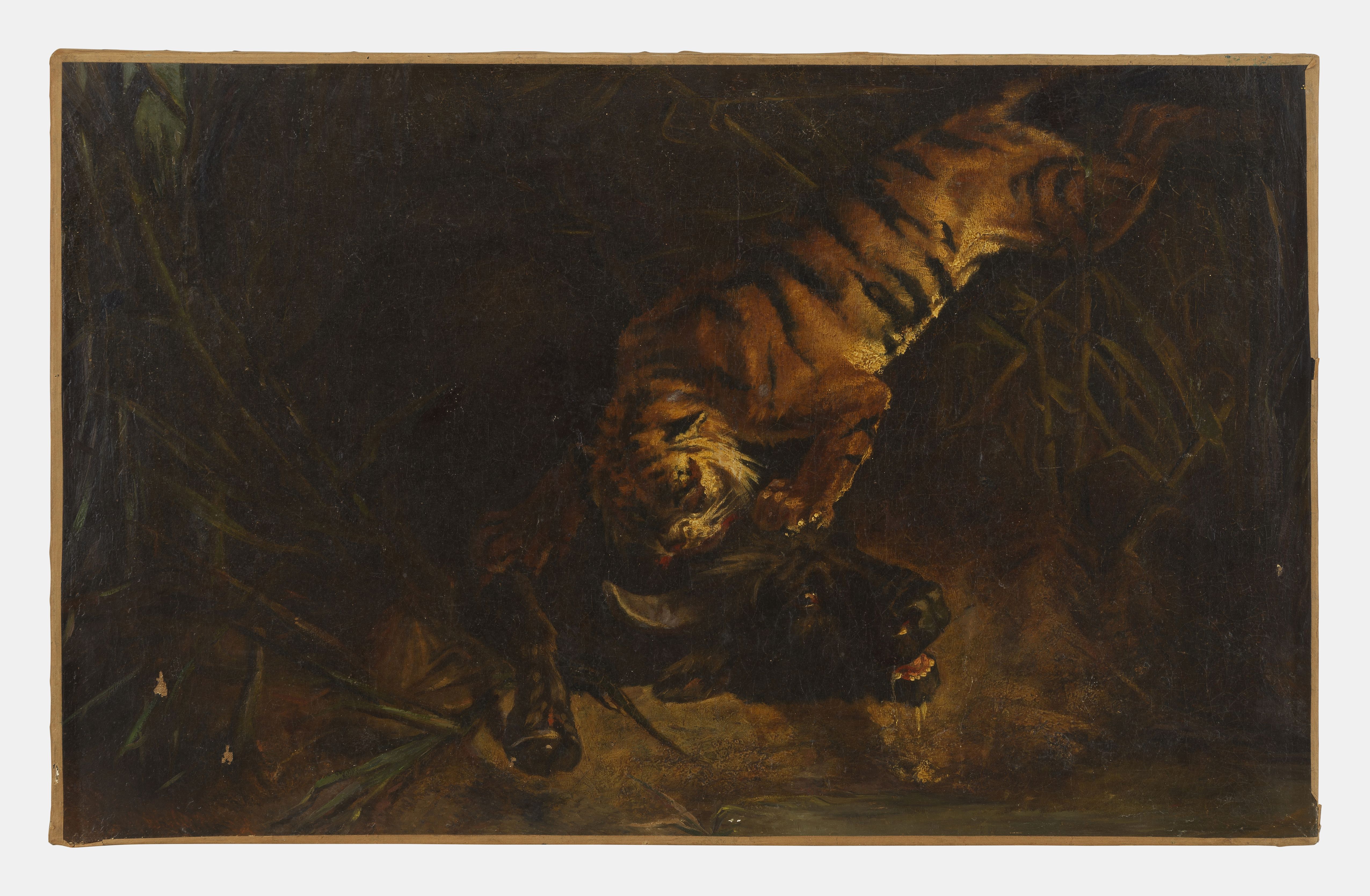 L’attaque du tigre contre le buffle, huile sur toile, 60x93 cm