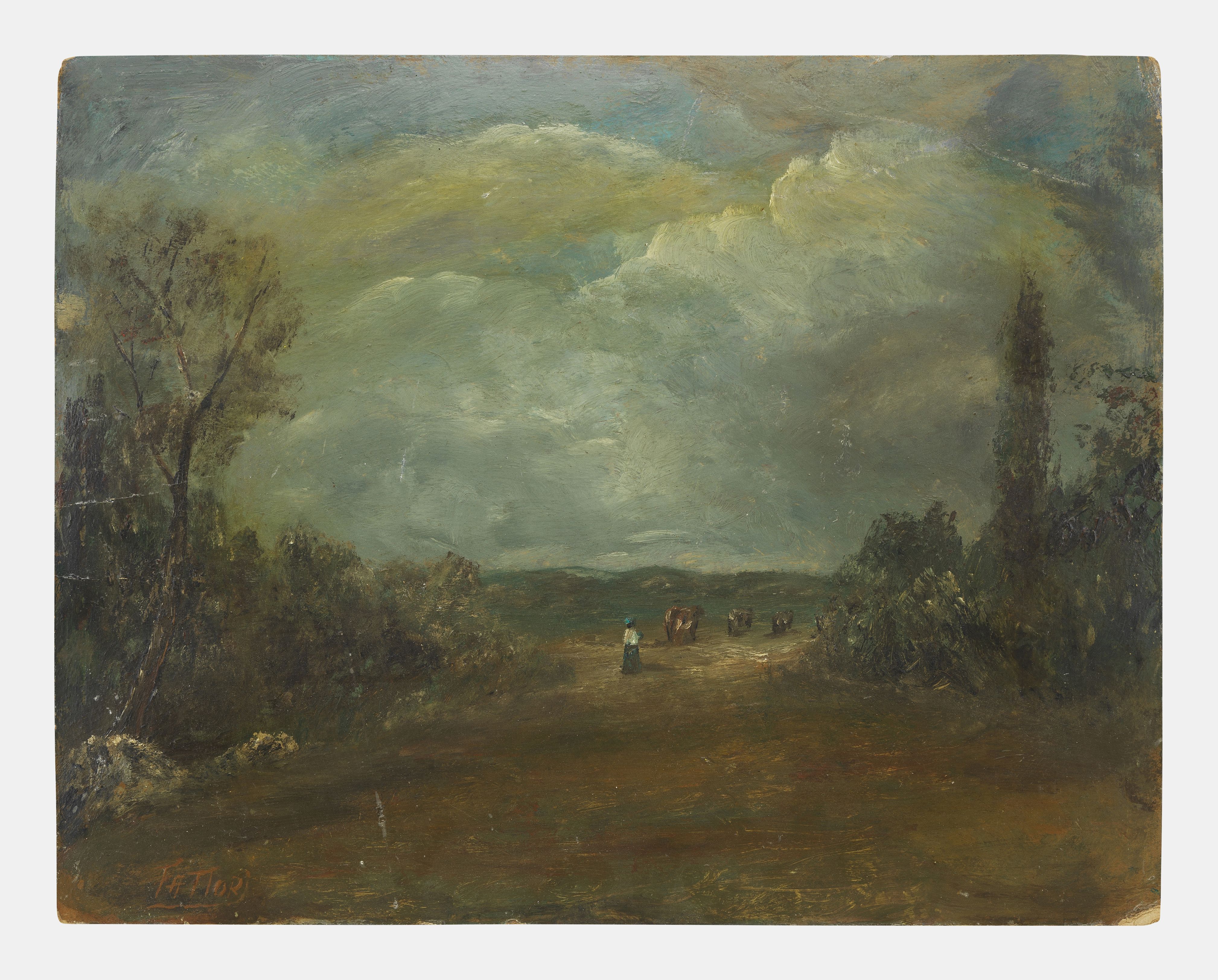 Paysage animé, huile sur carton, signée Fattori, 30x39 cm