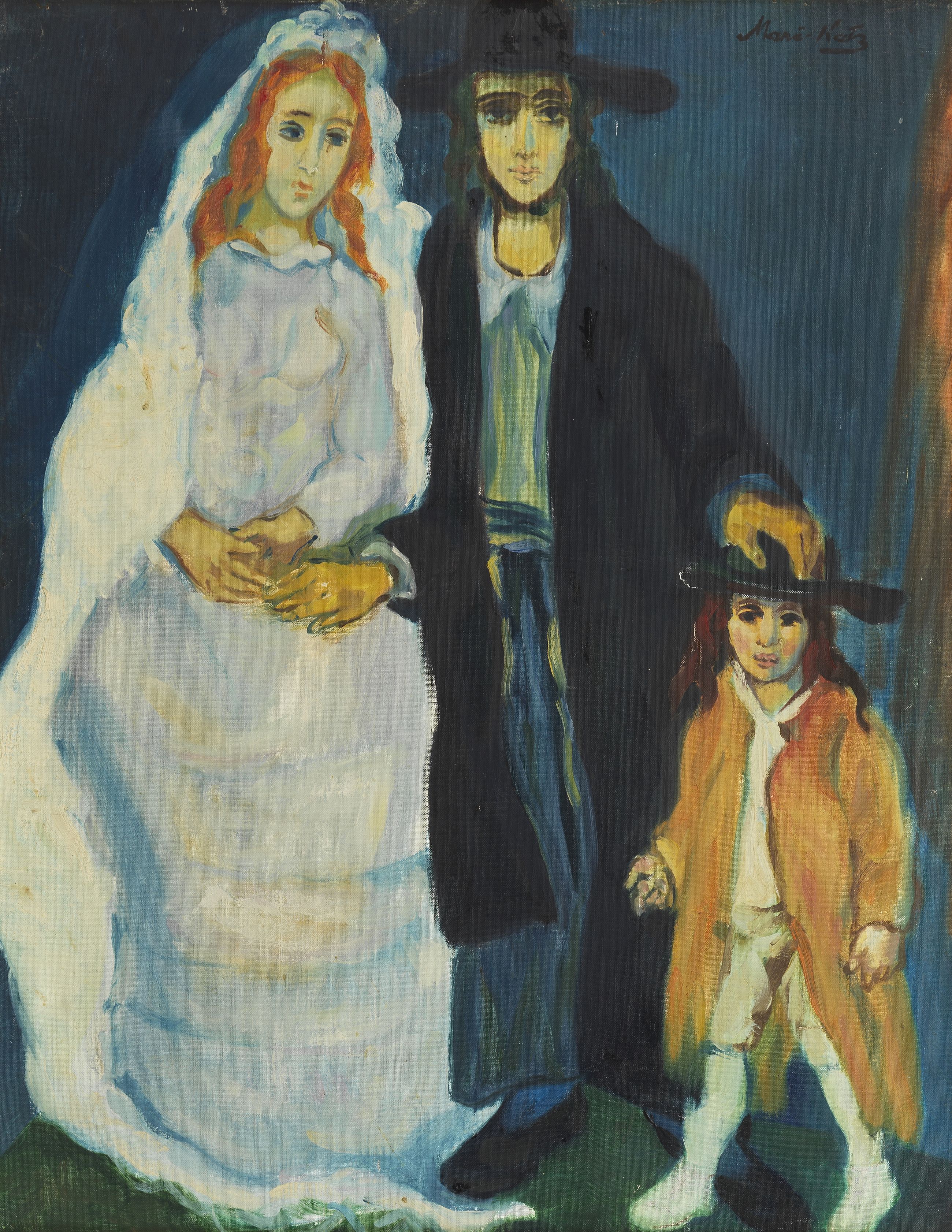 Couple de mariés et enfant, huile sur toile, signée, 90x70 cm. C...