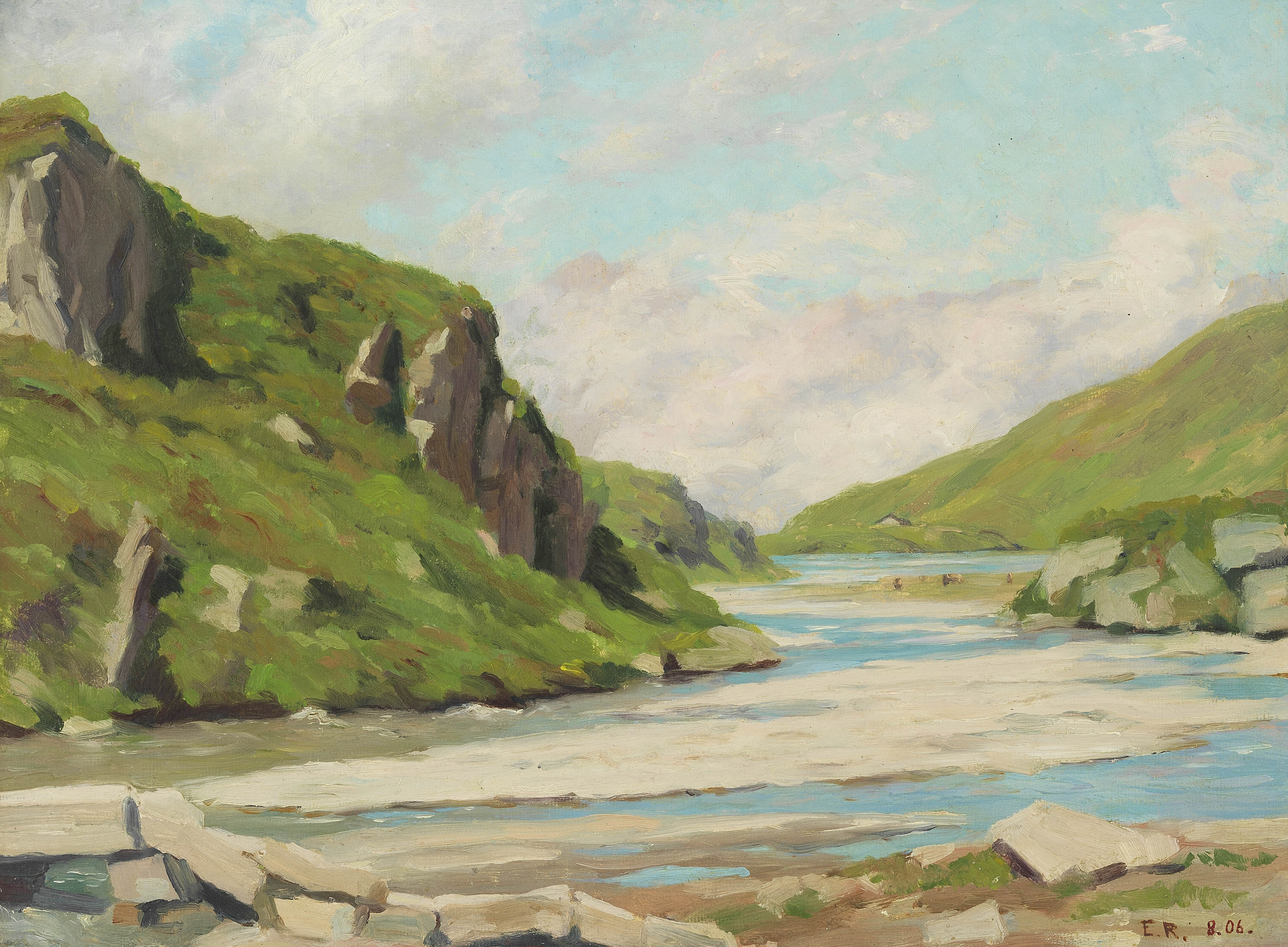 Rivière d'alpage en Valais, huile sur toile, monogrammée et daté...
