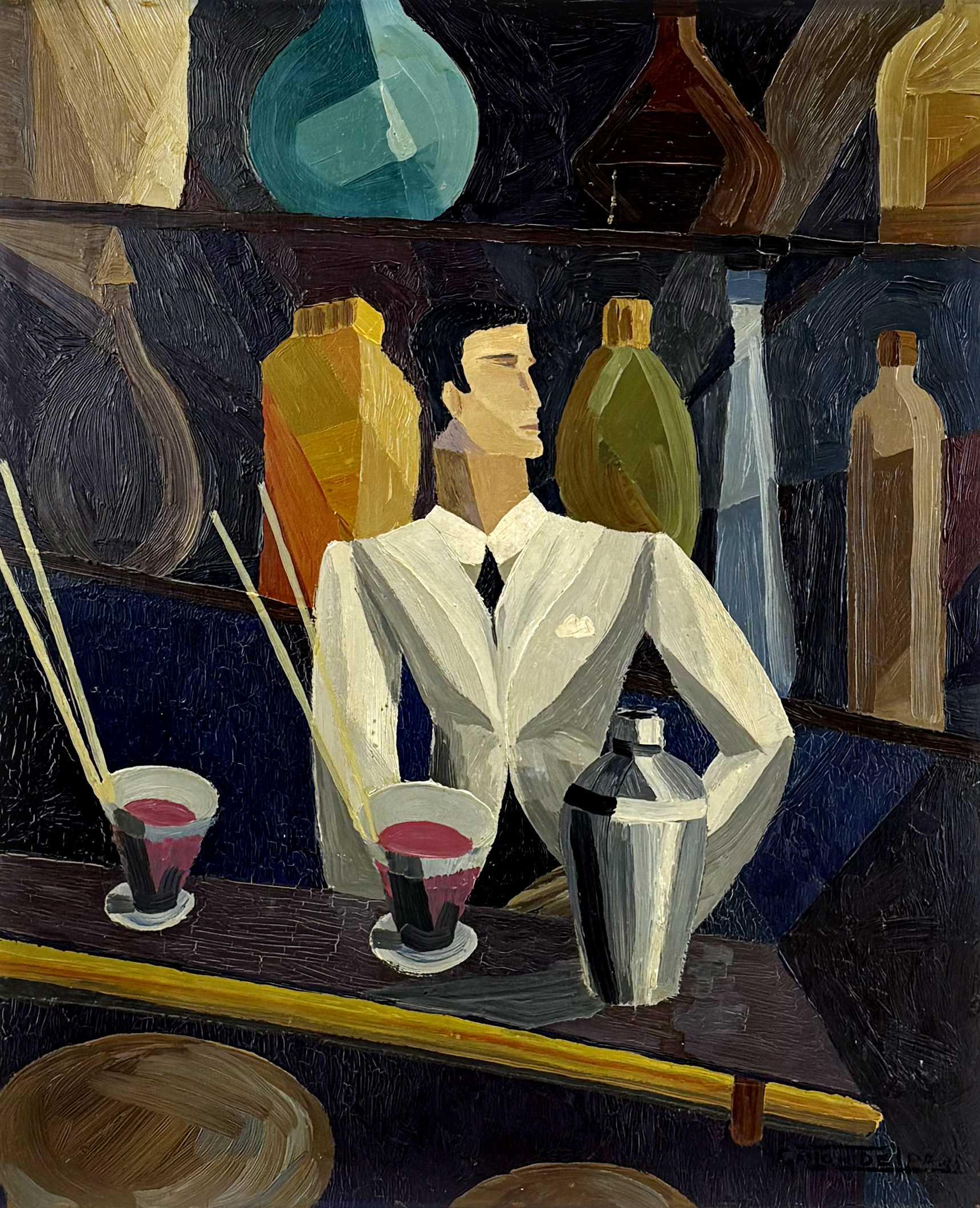Barman, huile sur panneau, circa 1930, signée, 64x50 cm