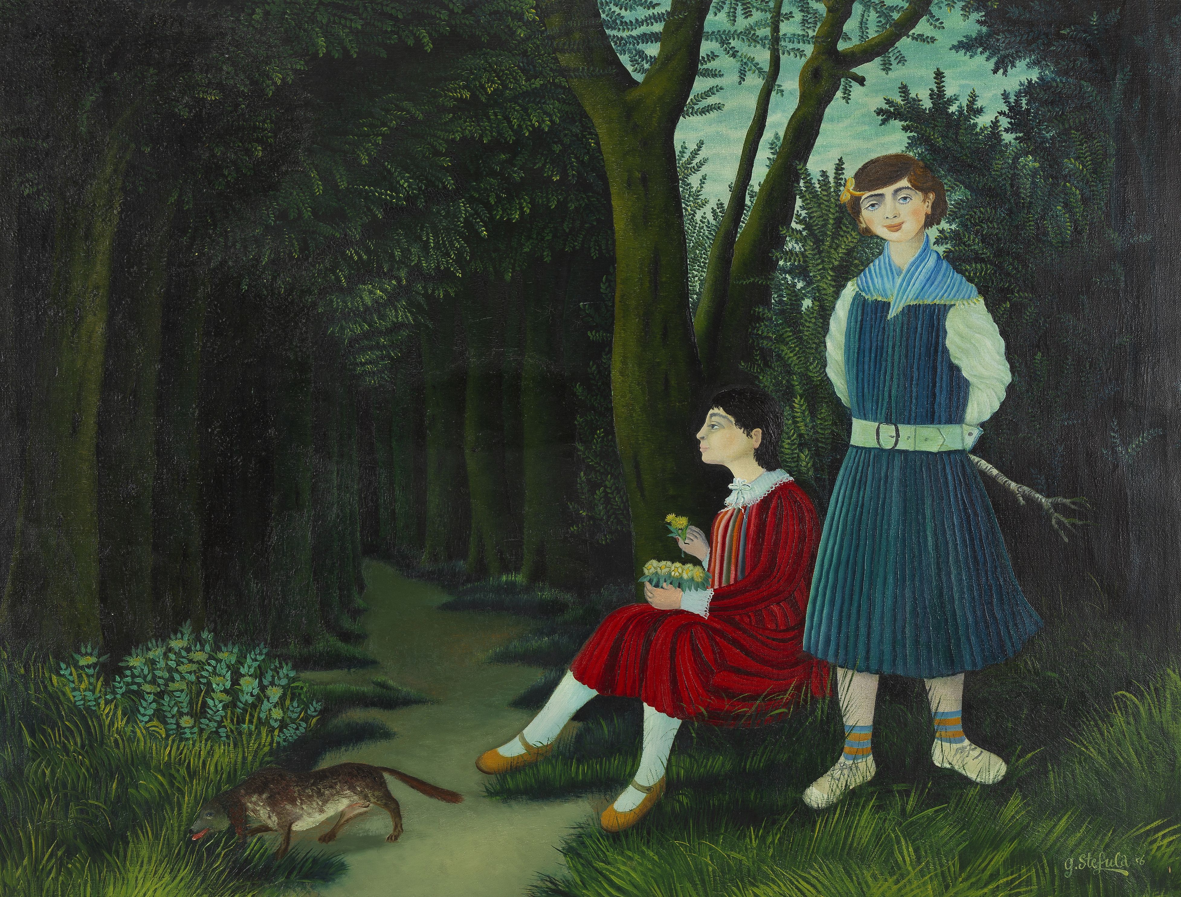 Scène naïve dans la forêt, huile sur toile, signée et datée 56,...