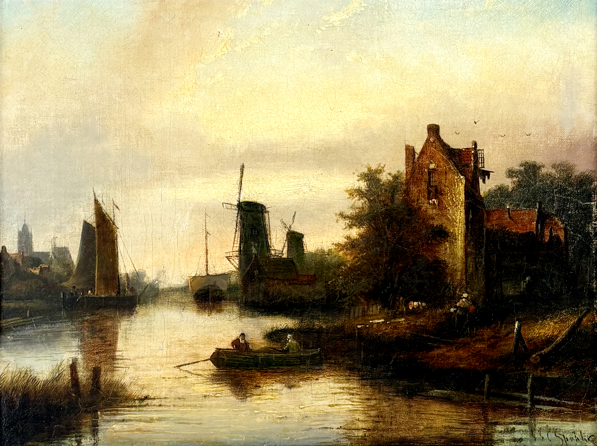 Les moulins au crépuscule, huile sur panneau, signée, 32x42 cm