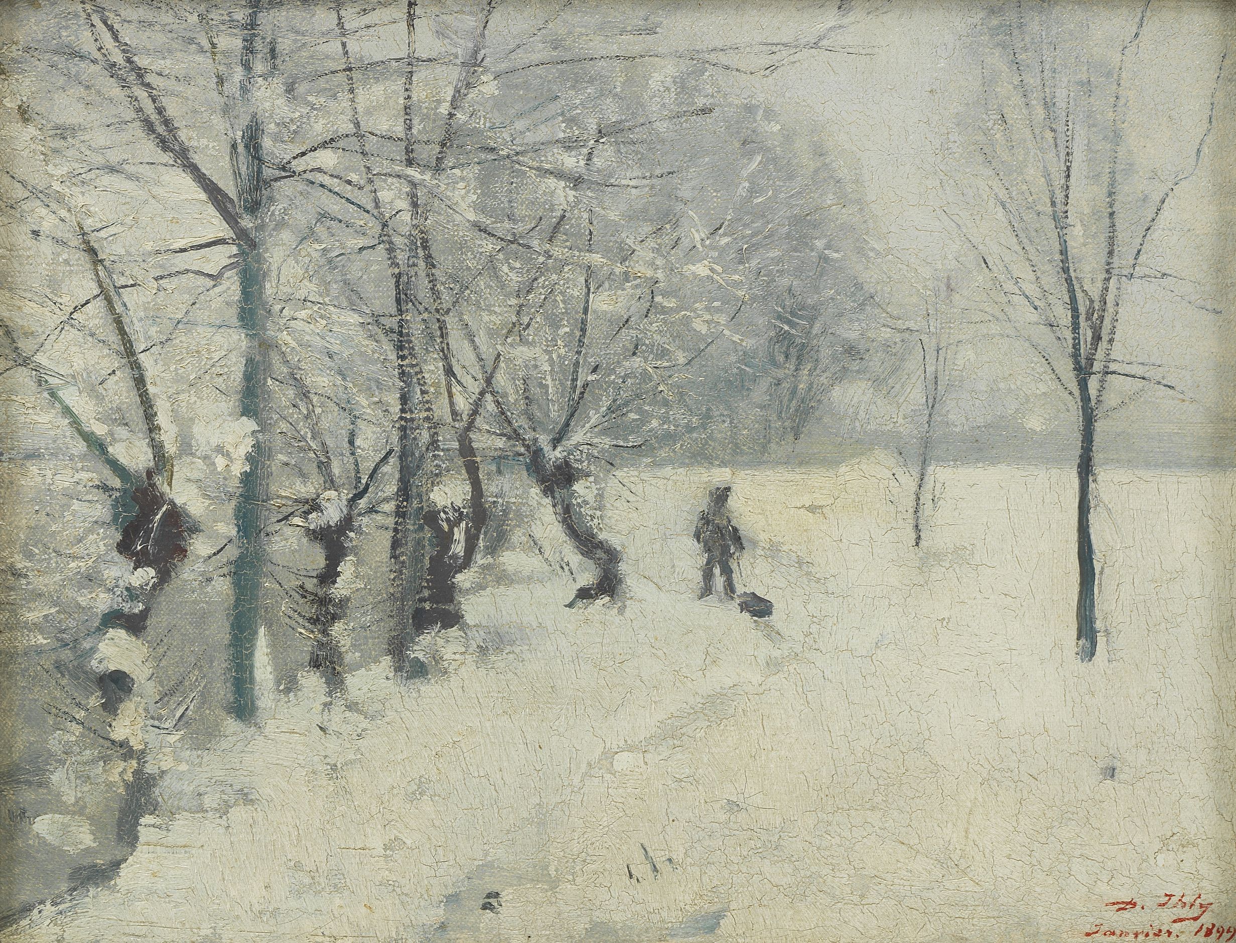 Sentier hivernal, huile sur toile, signée et datée 1899, 35x46 c...