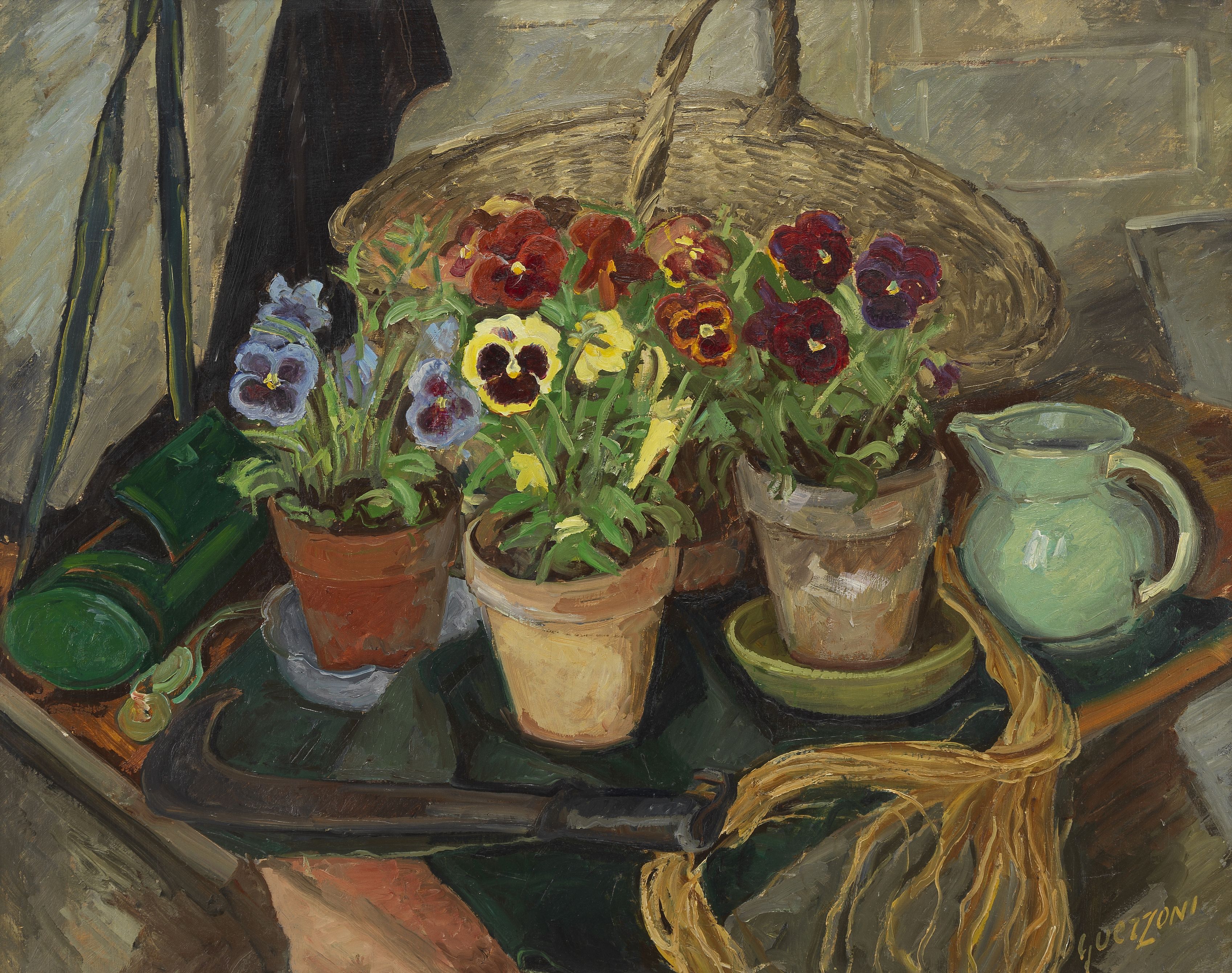 Nature morte aux pensées, huile sur panneau, signée, 72x92 cm