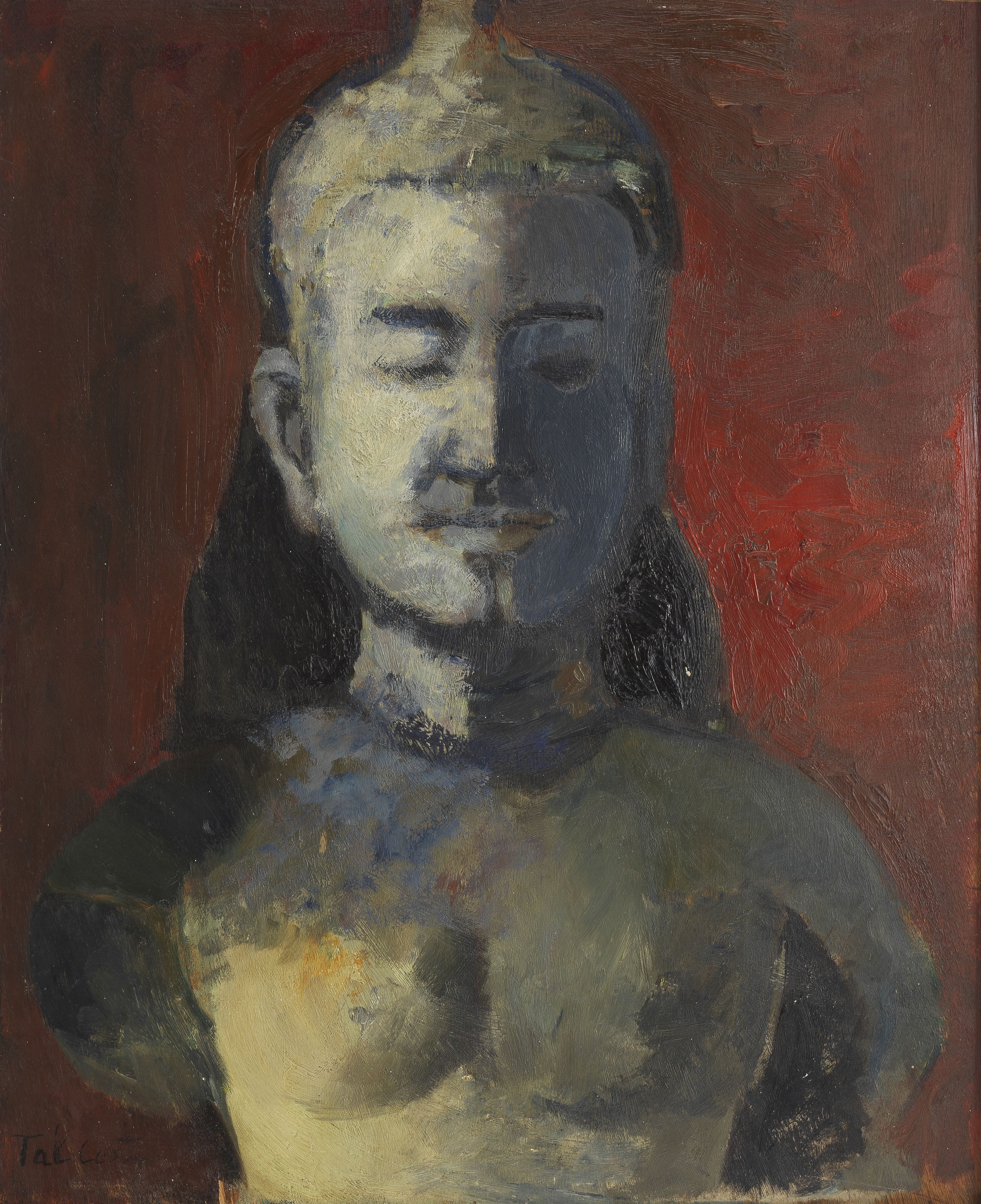 Tête de divinité, huile sur carton, signée, 59,5x50 cm