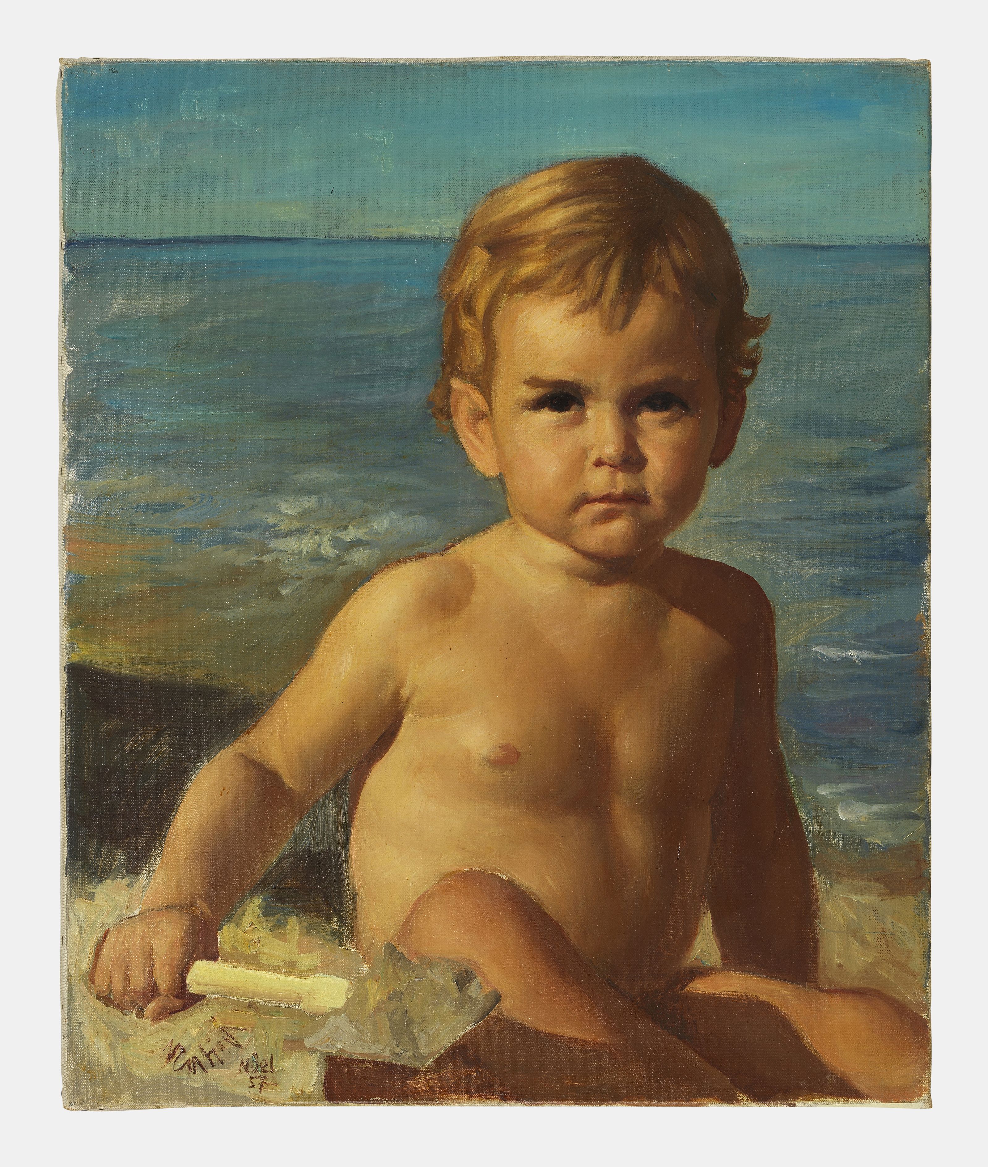 Portrait d'enfant au bord de la mer, huile sur toile, signée et...