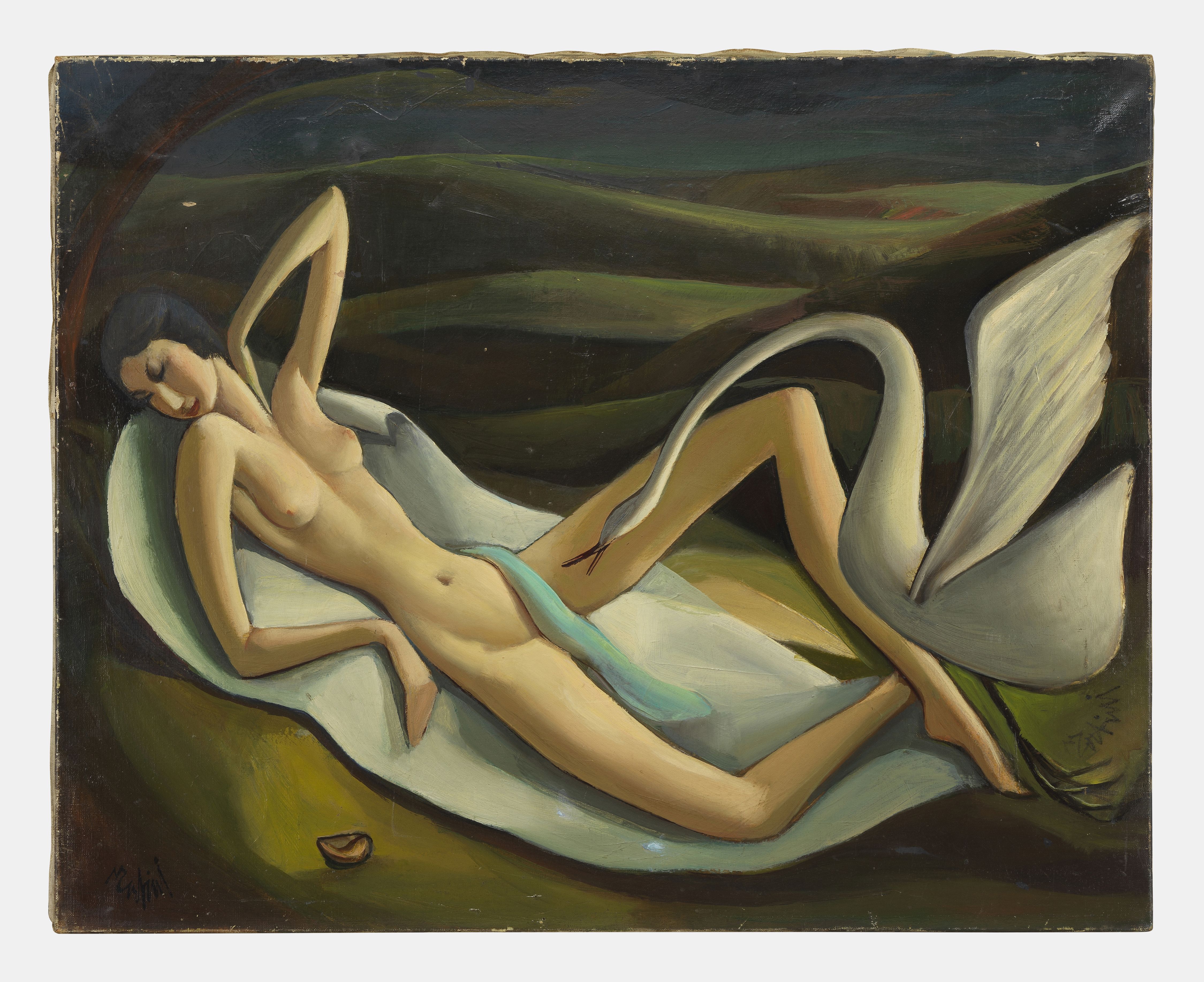 Leyda et le cygne, huile sur toile, signée, 65x80 cm