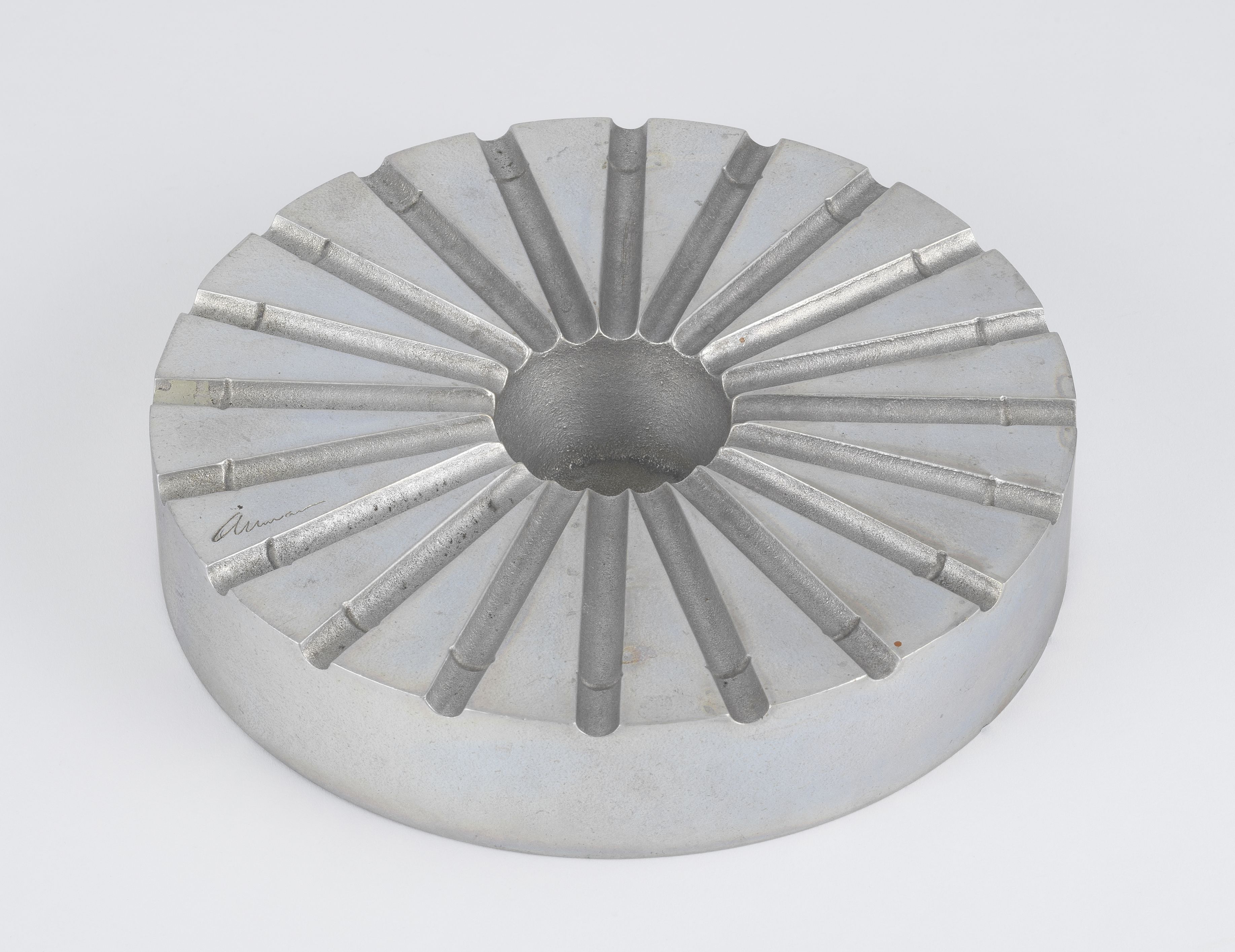 Accumulation de cigarettes, cendrier en aluminium, signé, D 19 c...