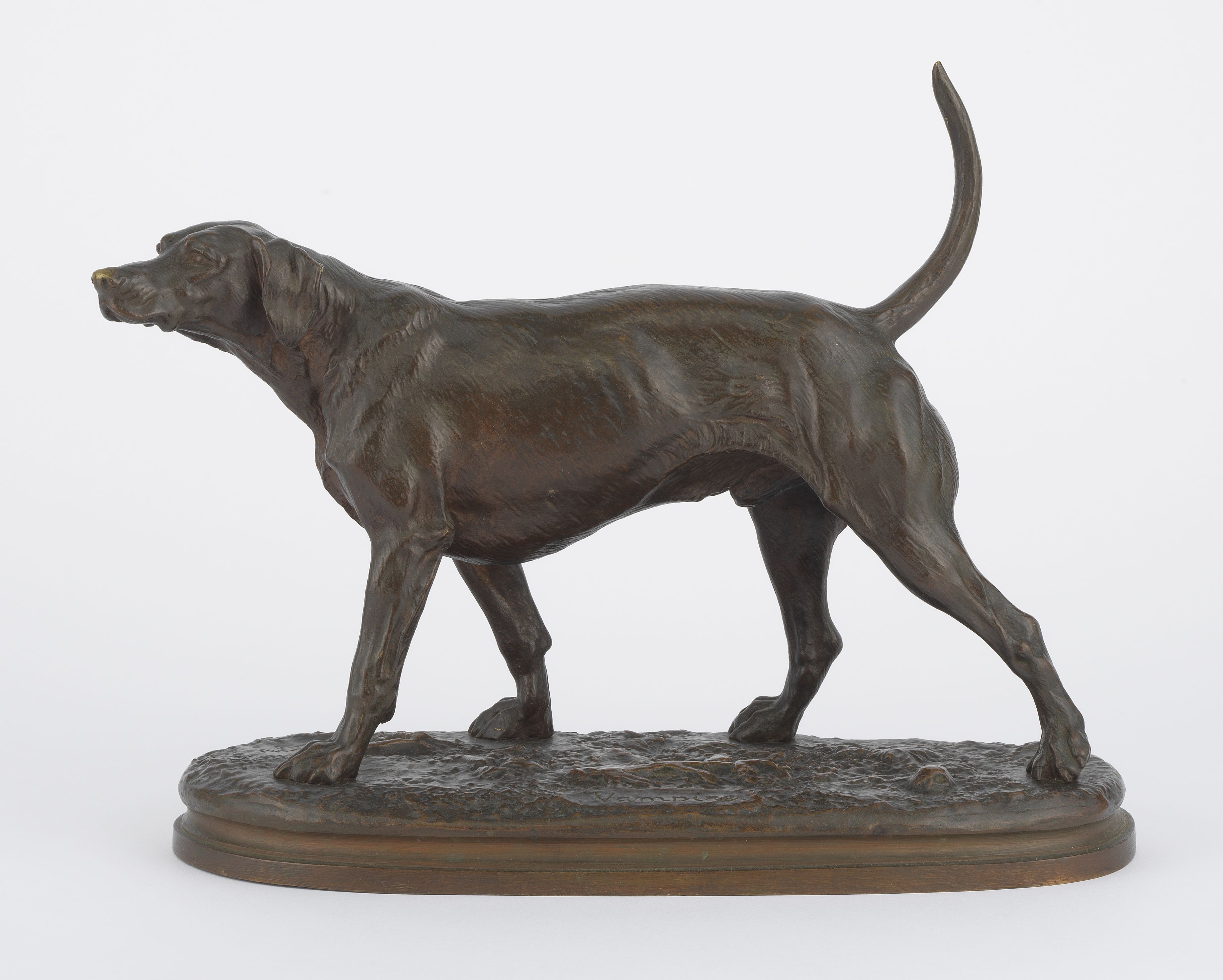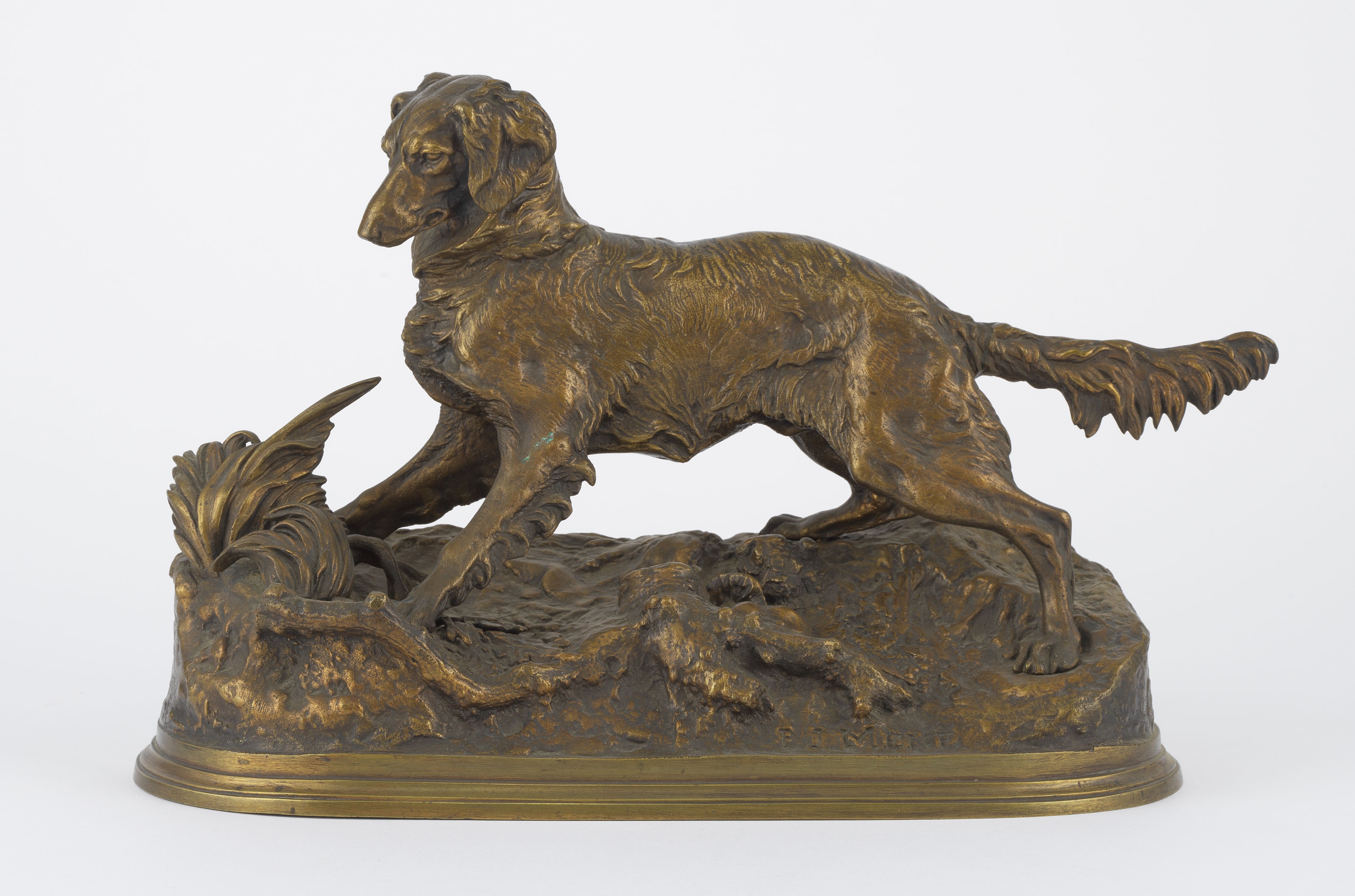 Chien épagneul à l'arrêt, bronze à patine brune, signé, 22x30x15...