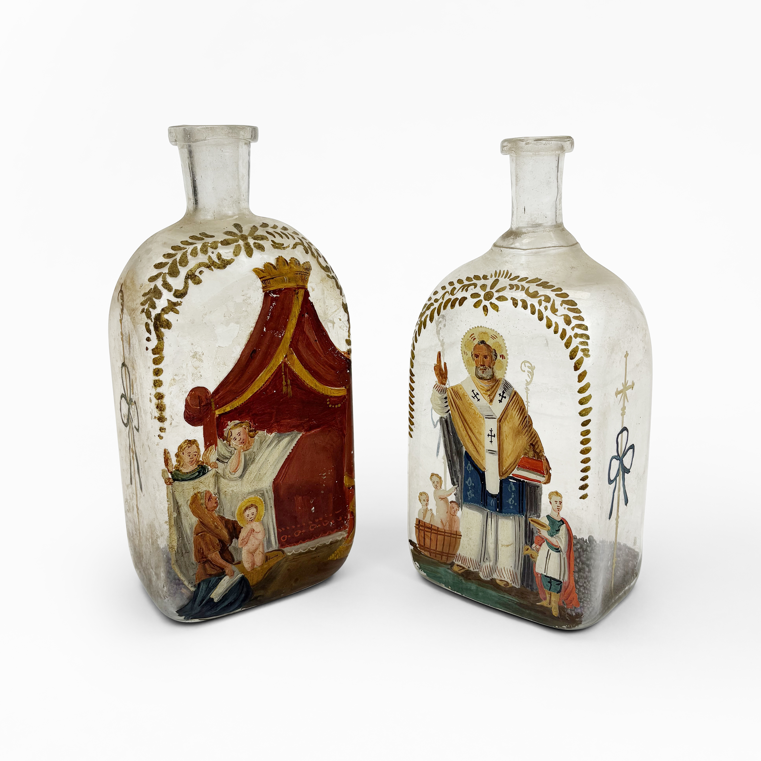 Verre peint à décor de scènes religieuses, H 26 et 27 cm. Proven...