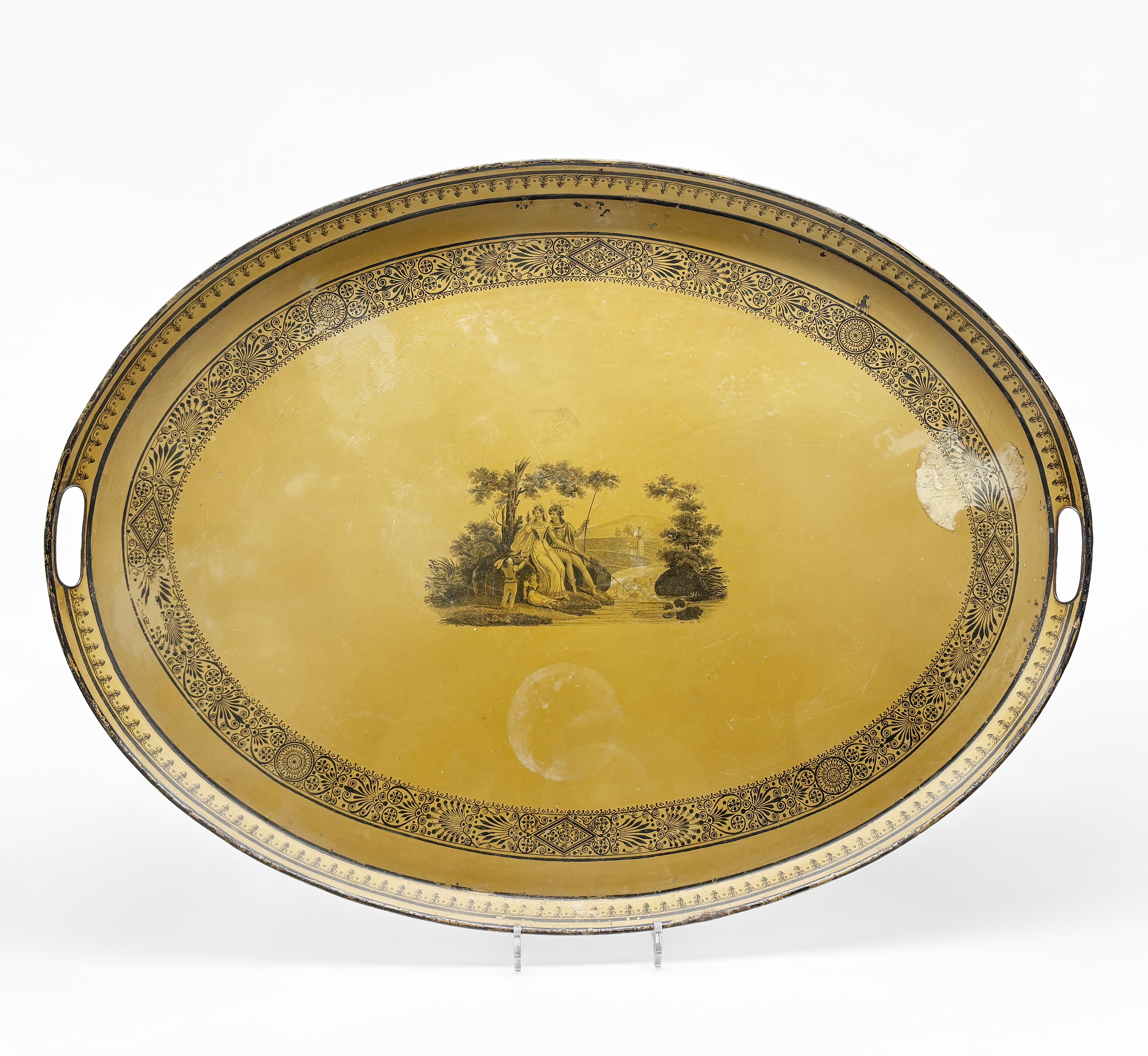 Tôle peinte à décor de scène galante, L 73 cm. Provenance: ancie...