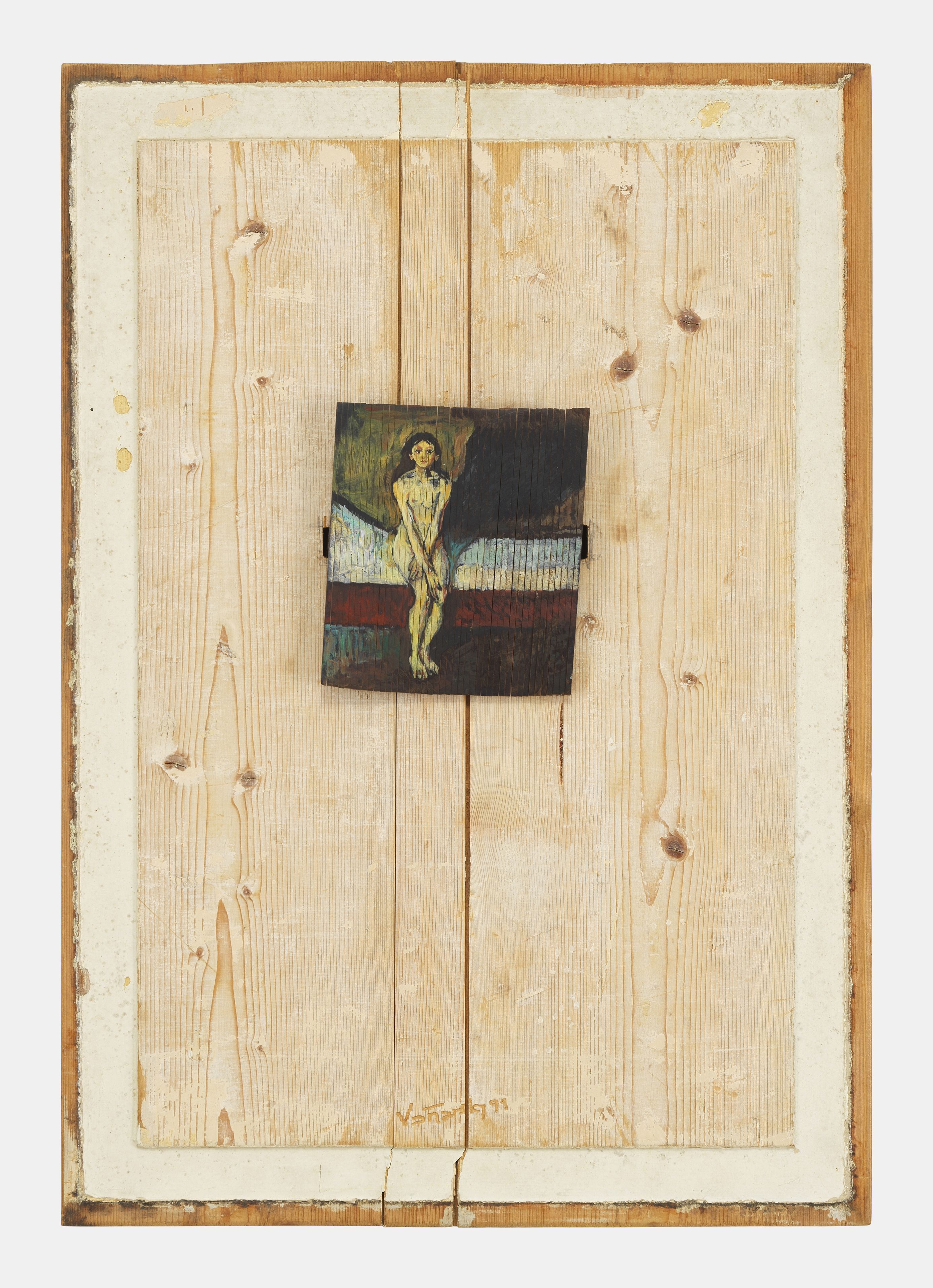 Nu assis, inspiré d'Edward Munch, huile sur bâtons en bois relié...