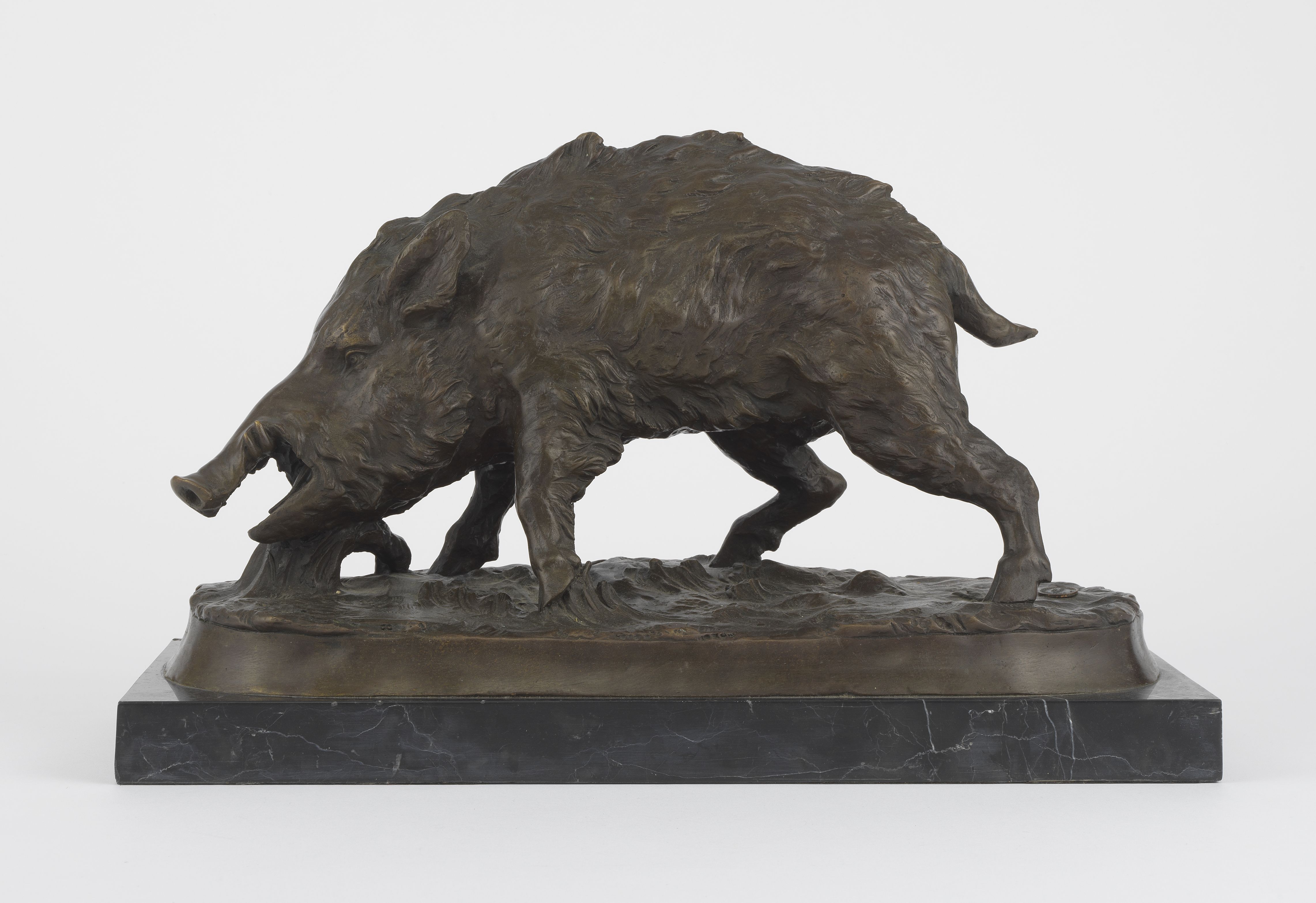 Sanglier, bronze à patine foncée, signé, portant un cachet bronz...