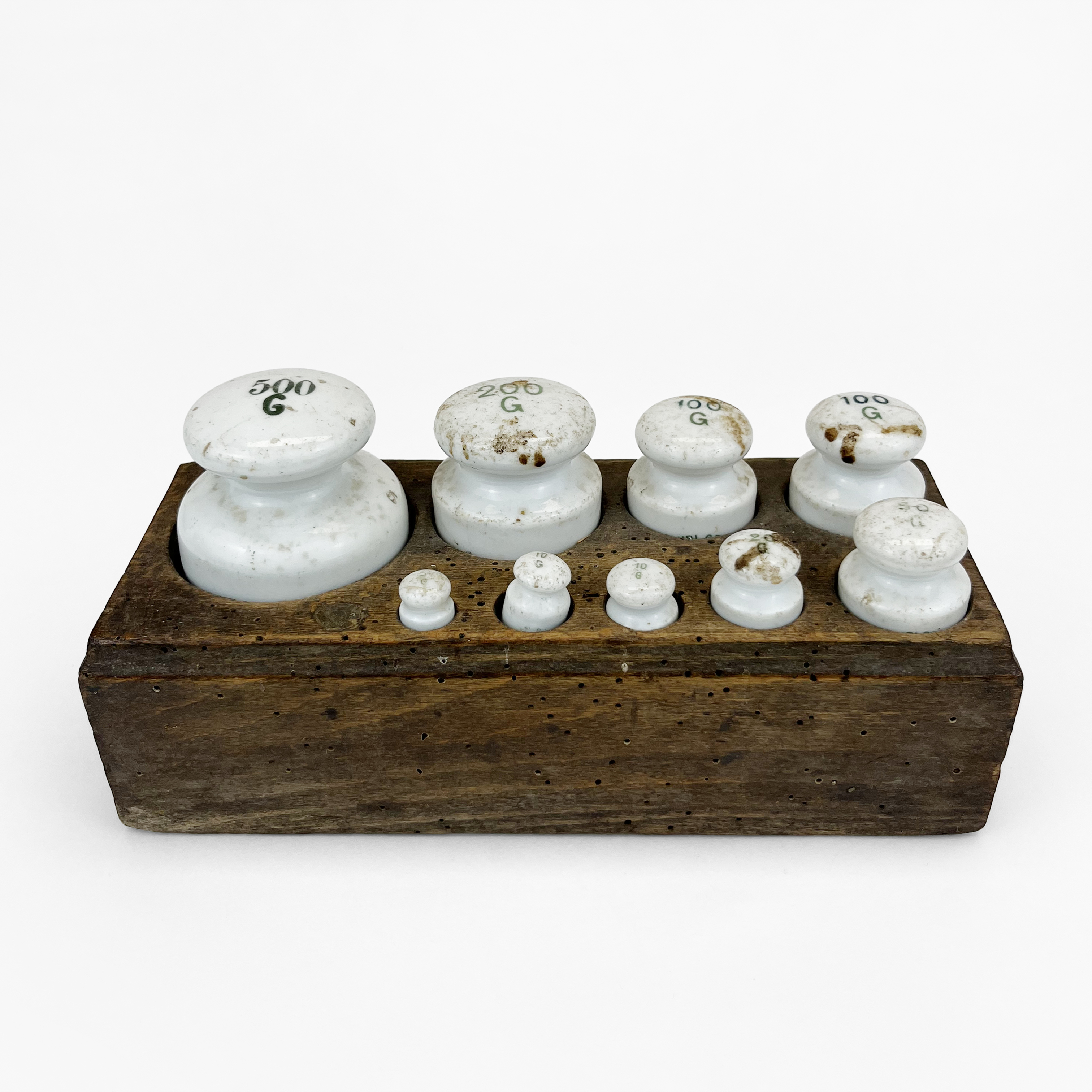 Porcelaine blanche, de 5 à 500 g, support en bois, L 22,5 cm. Pr...