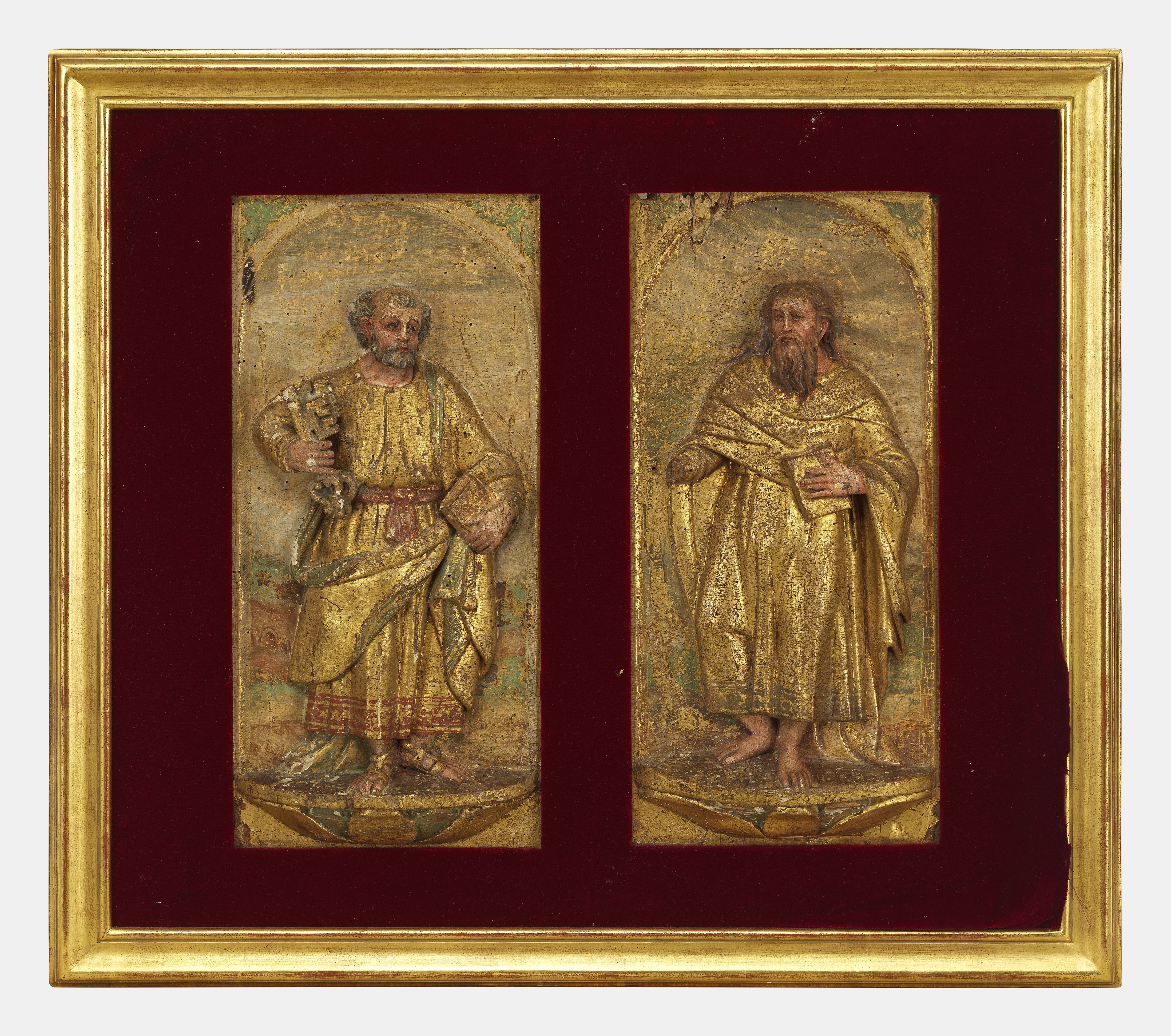 Deux bas-reliefs, bois sculpté et doré, 42x19 cm