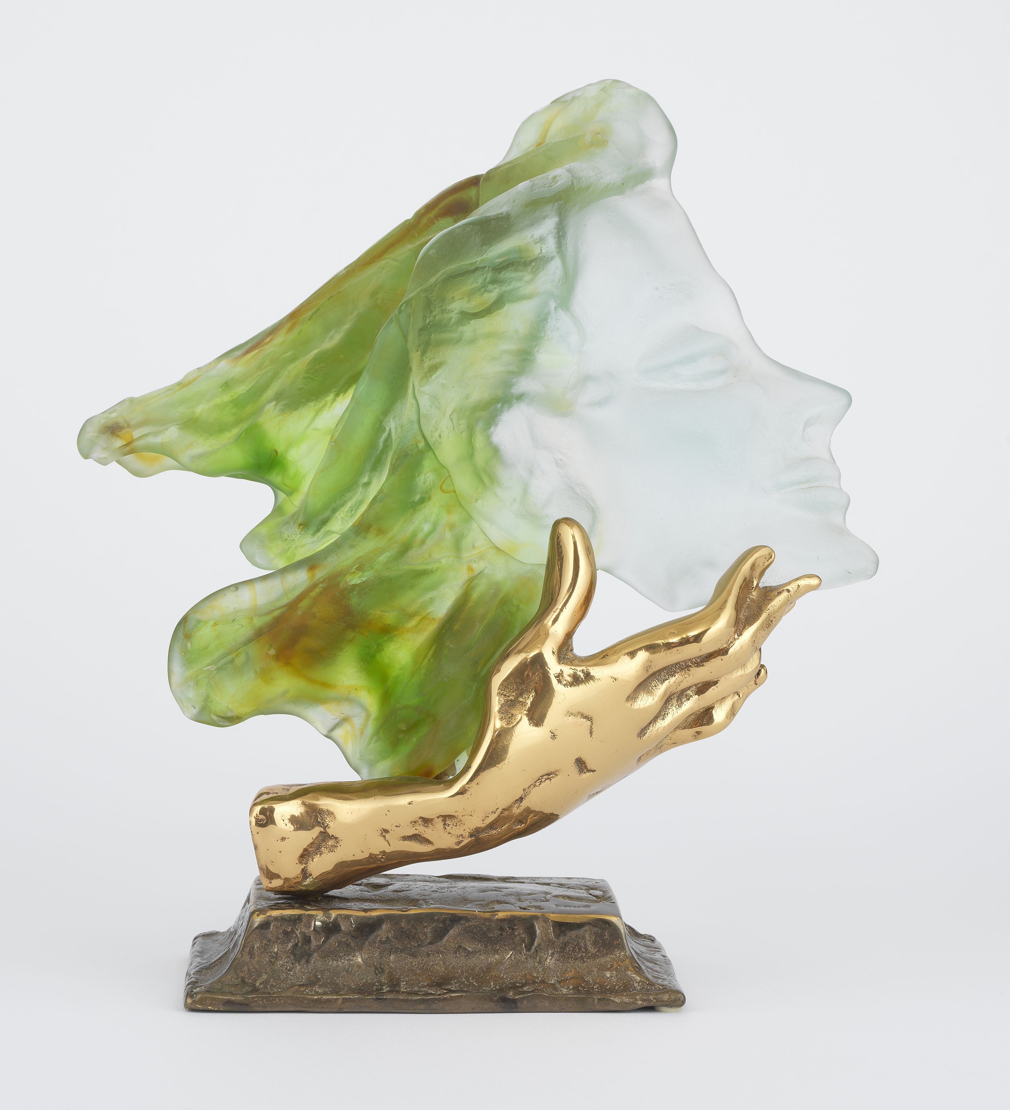 Main et visages, sculpture en pâte de verre et bronze, H 28 cm