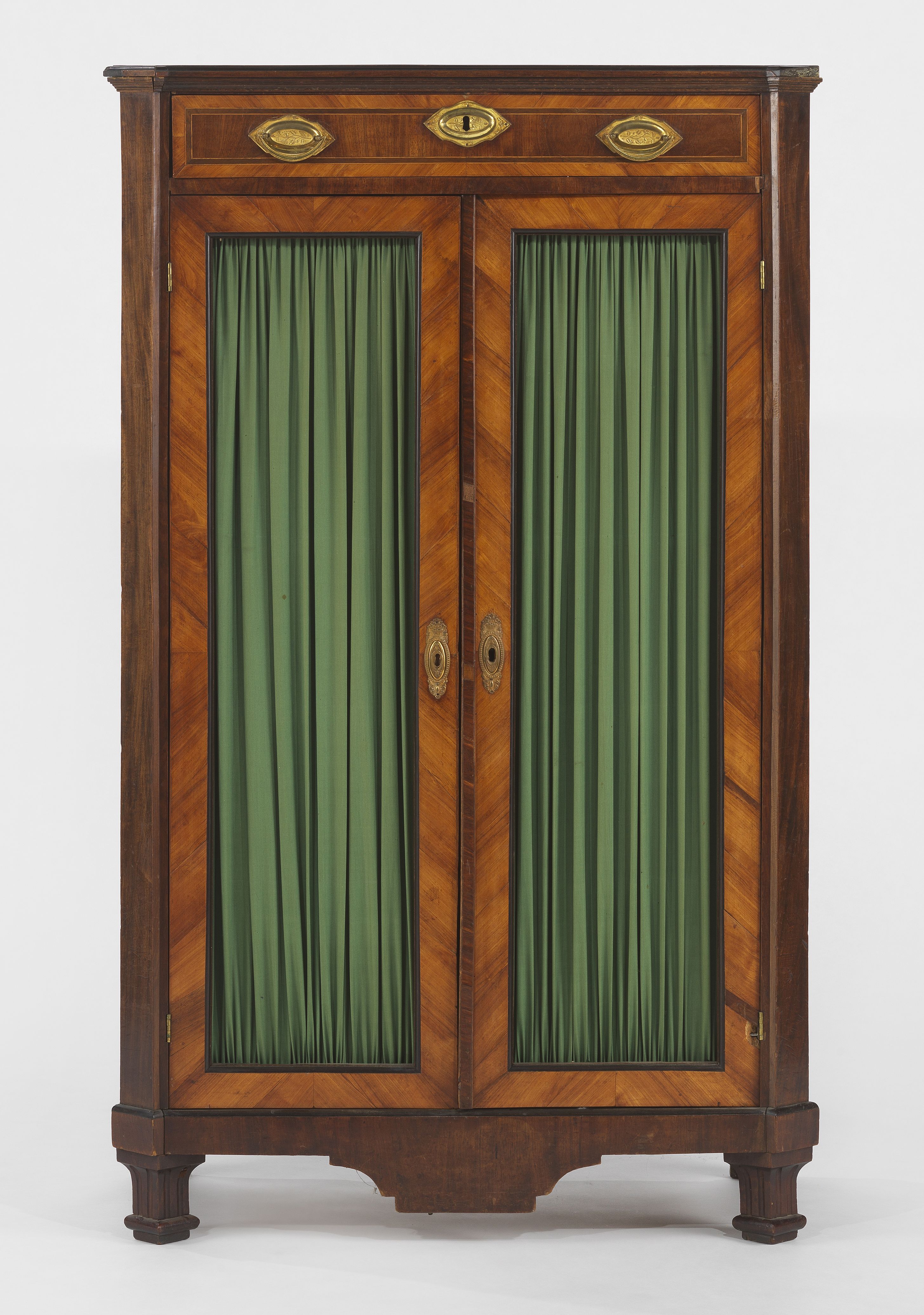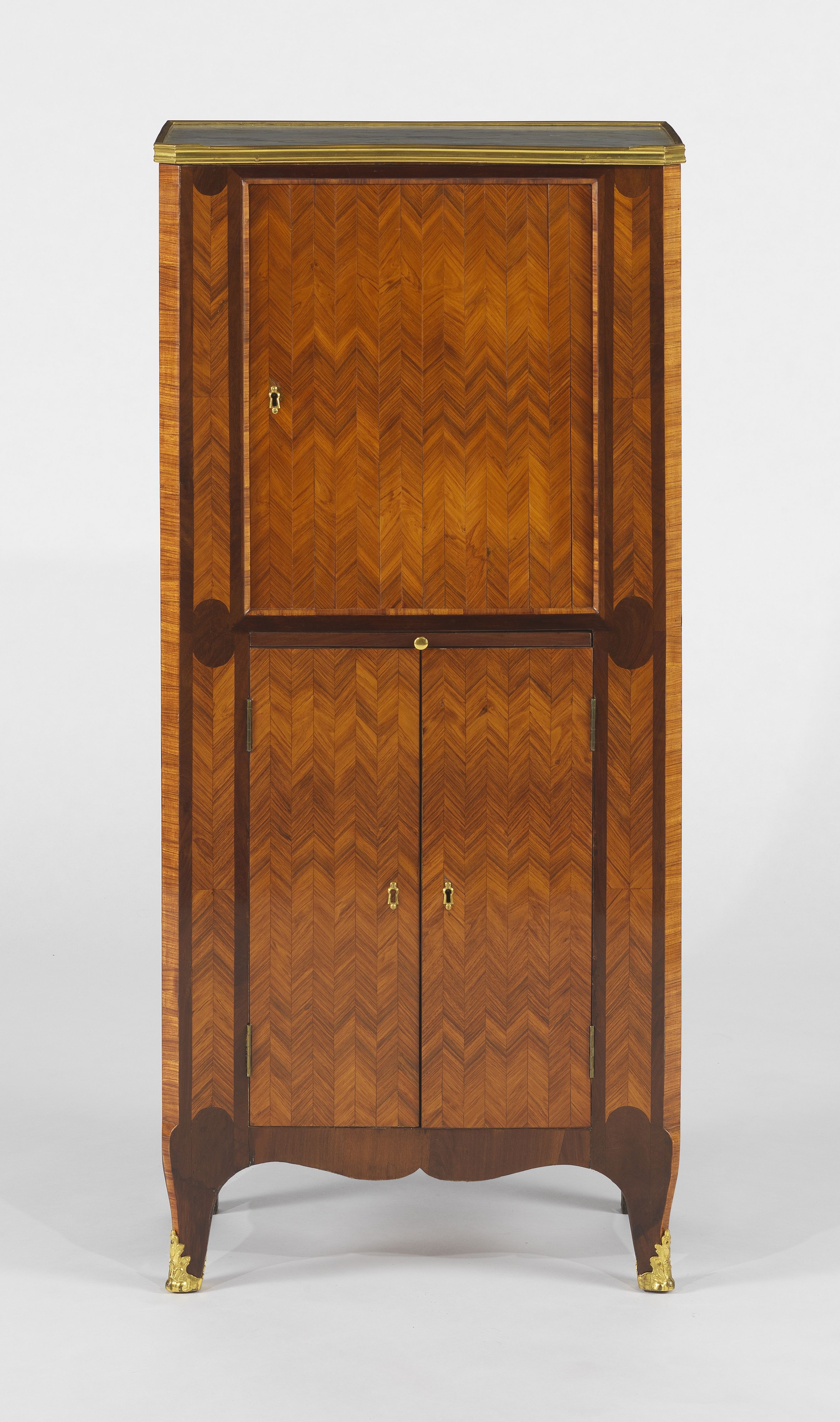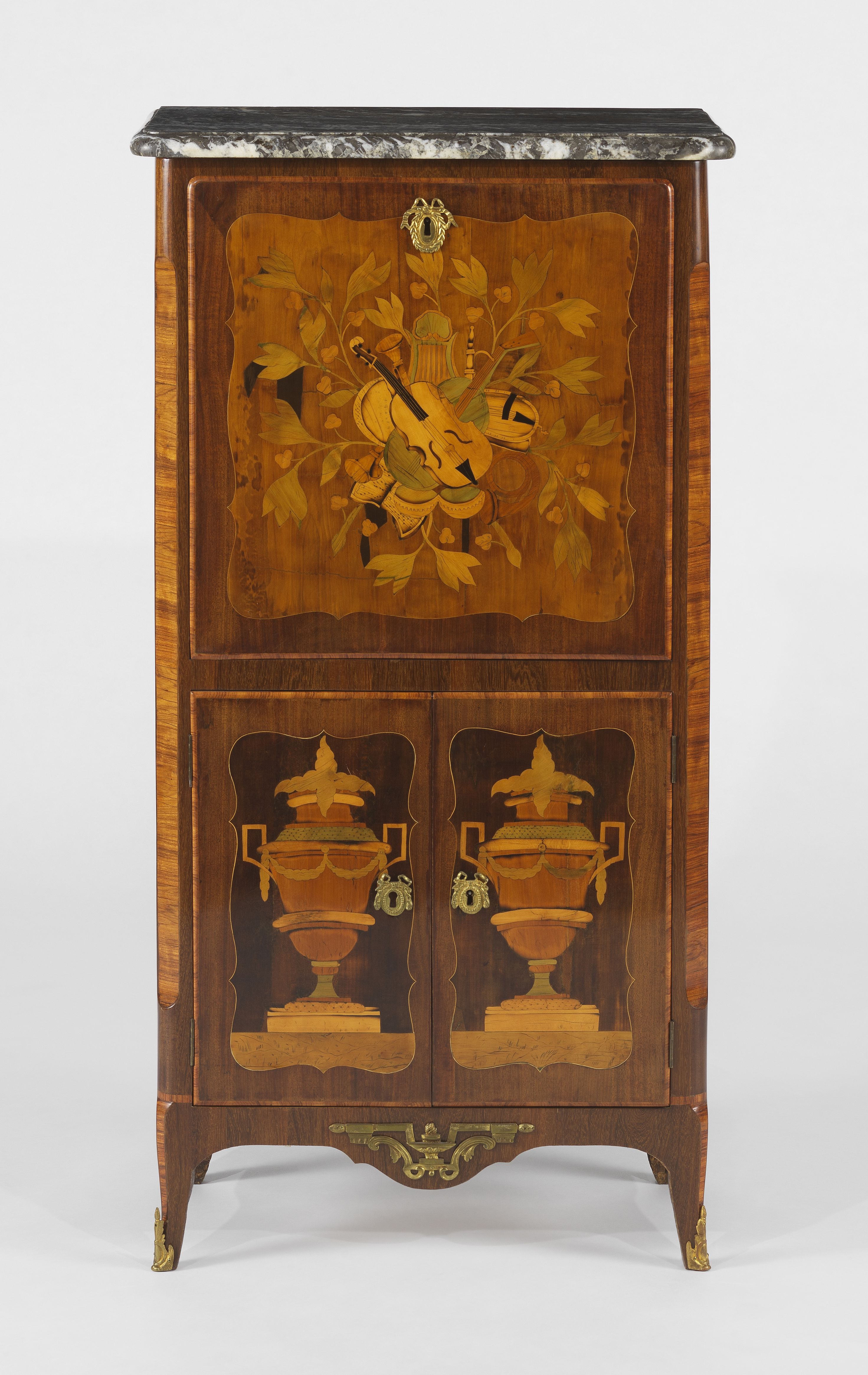 Un abattant, deux vantaux, bronze doré, marqueterie de bois frui...