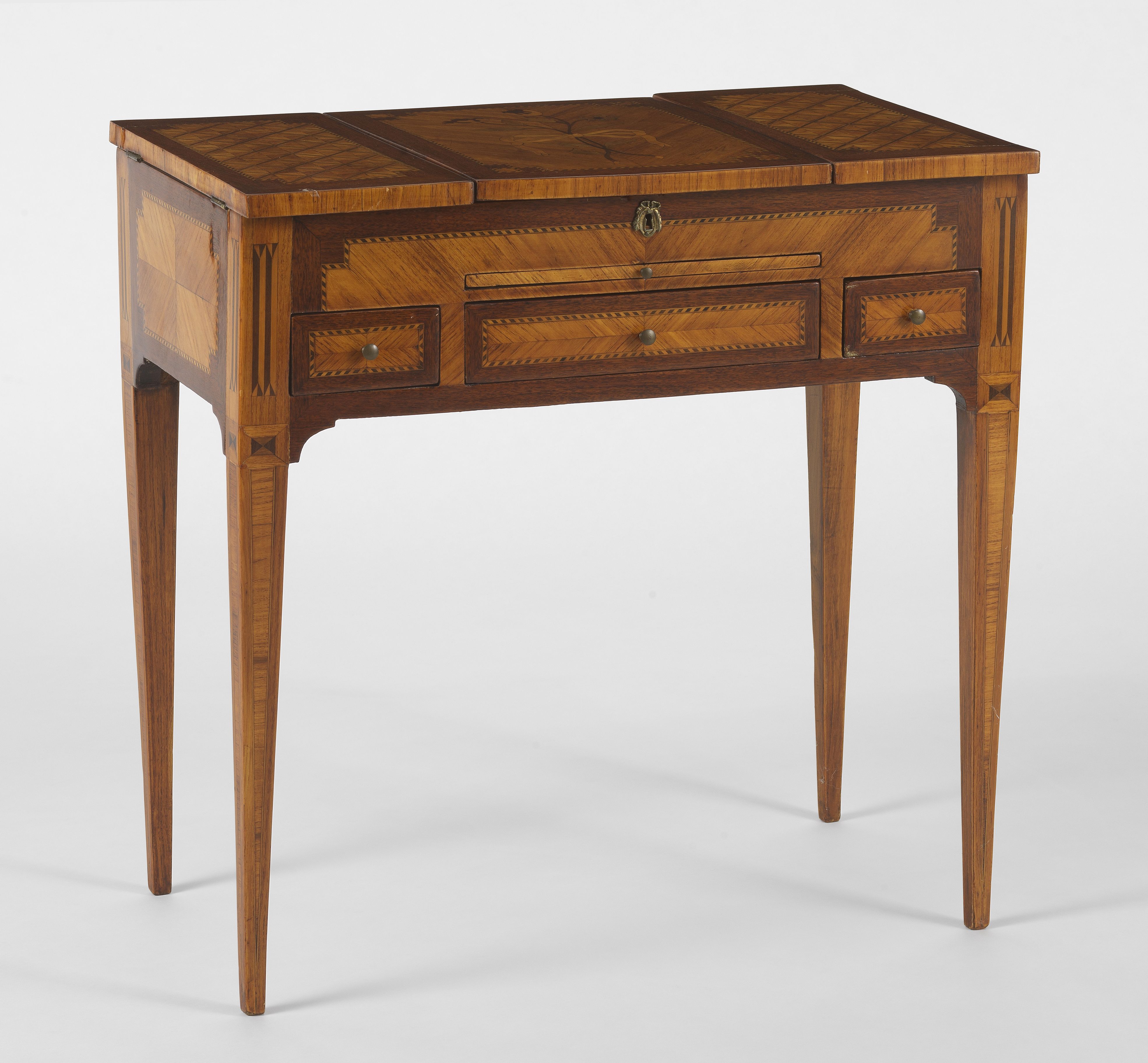 Bois fruitier et marqueterie à décor de damiers et de fleurs, 71...