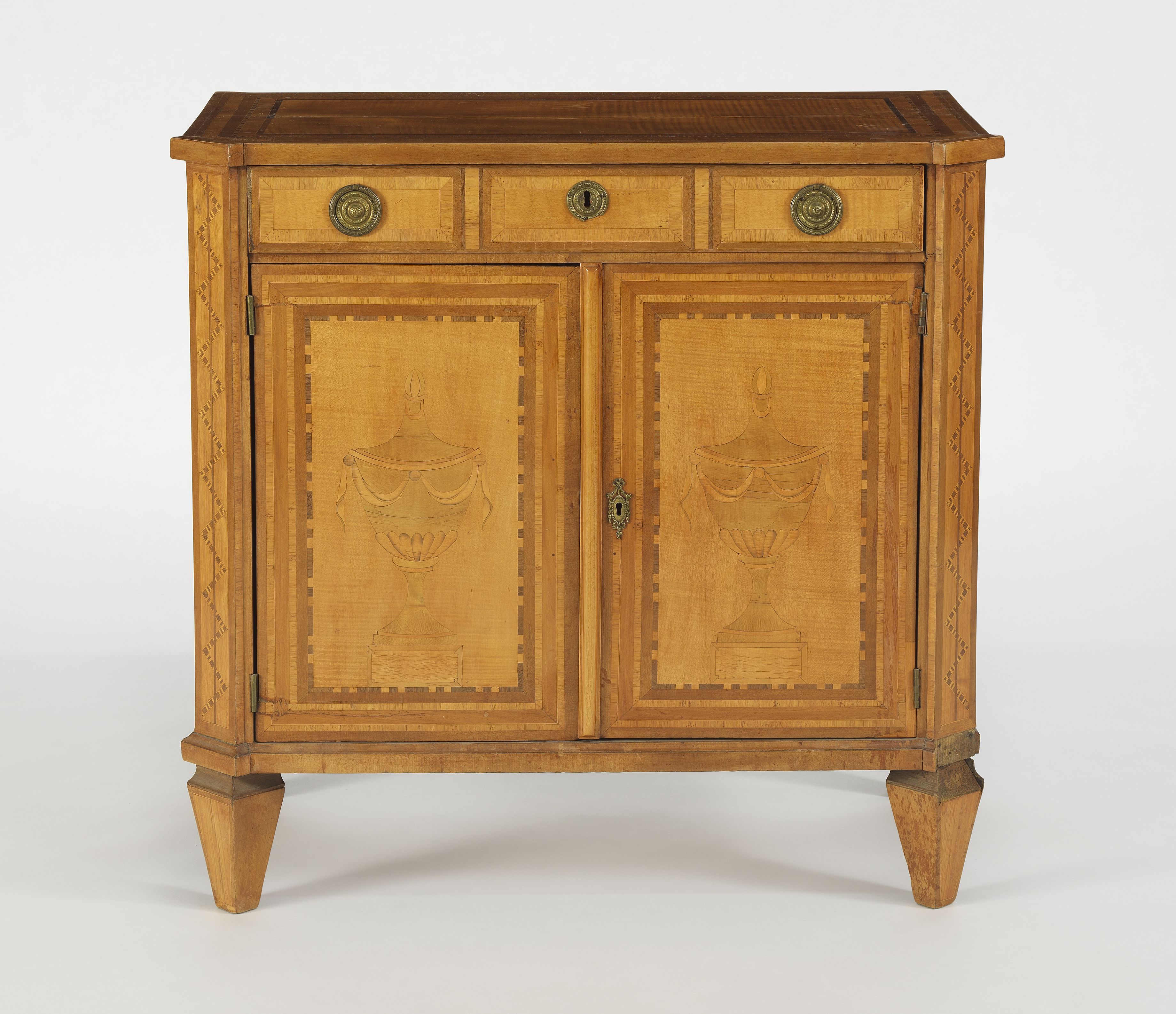 Un tiroir et deux vantaux, bois de placage à décor marqueté de v...