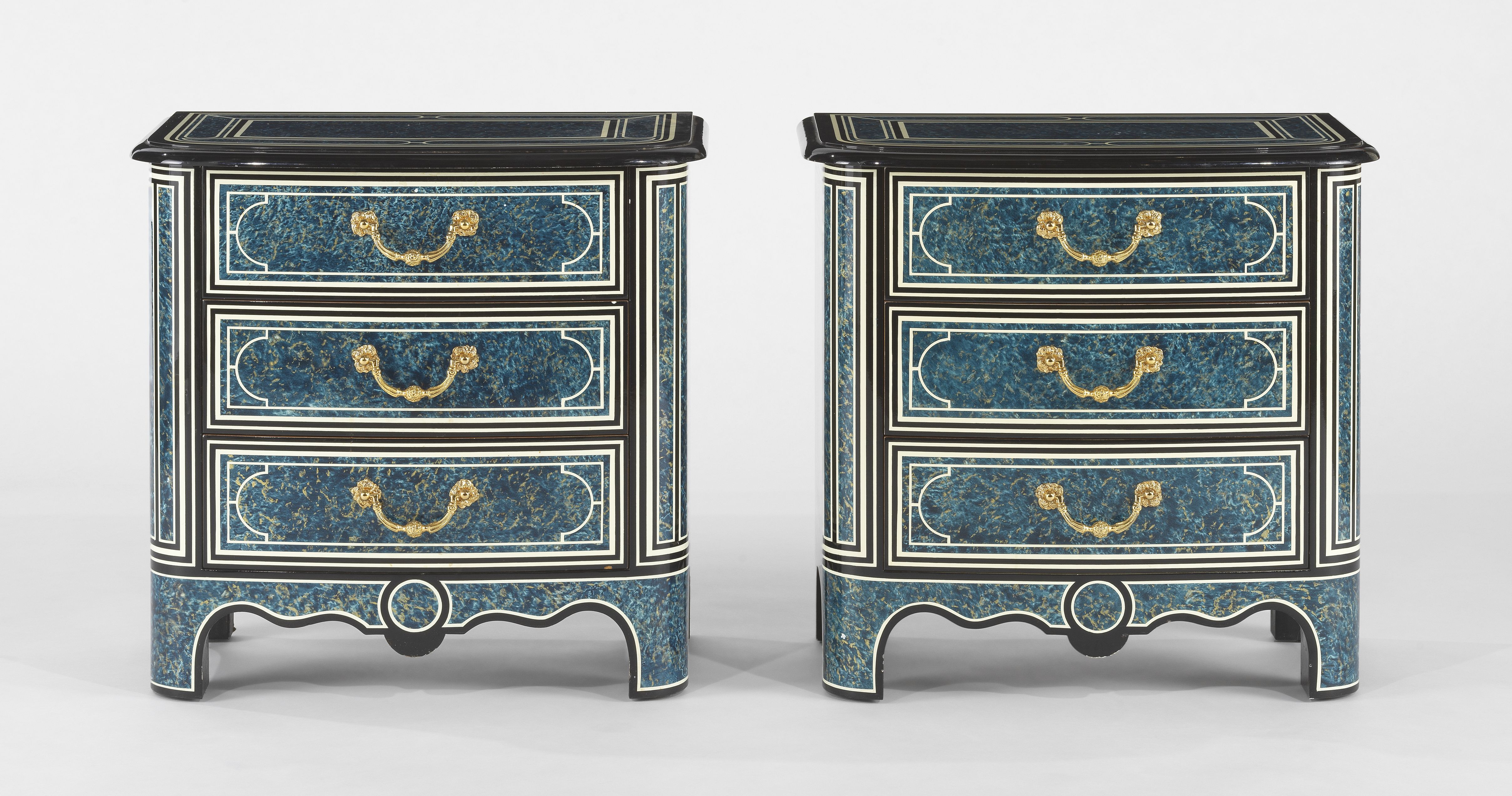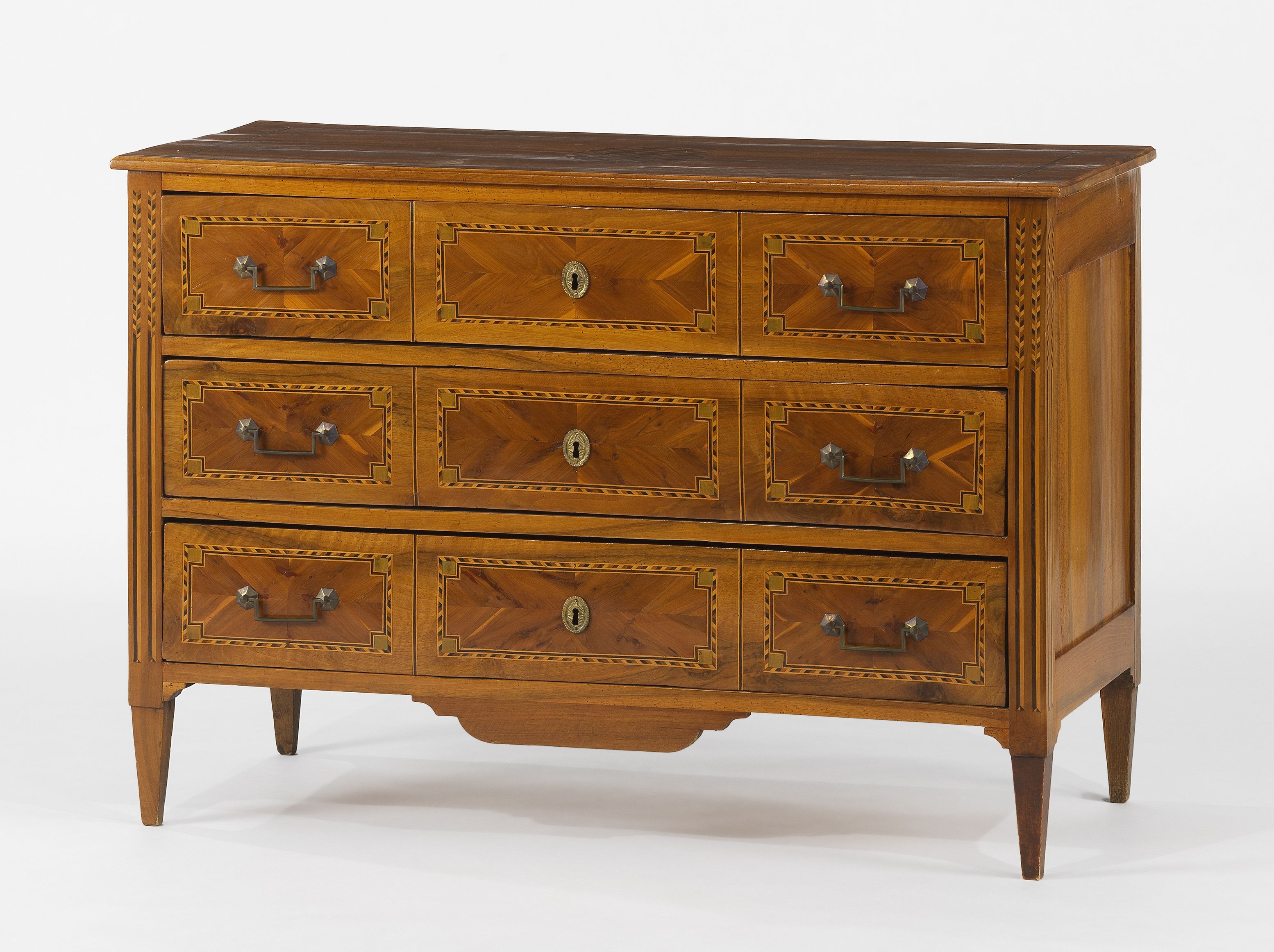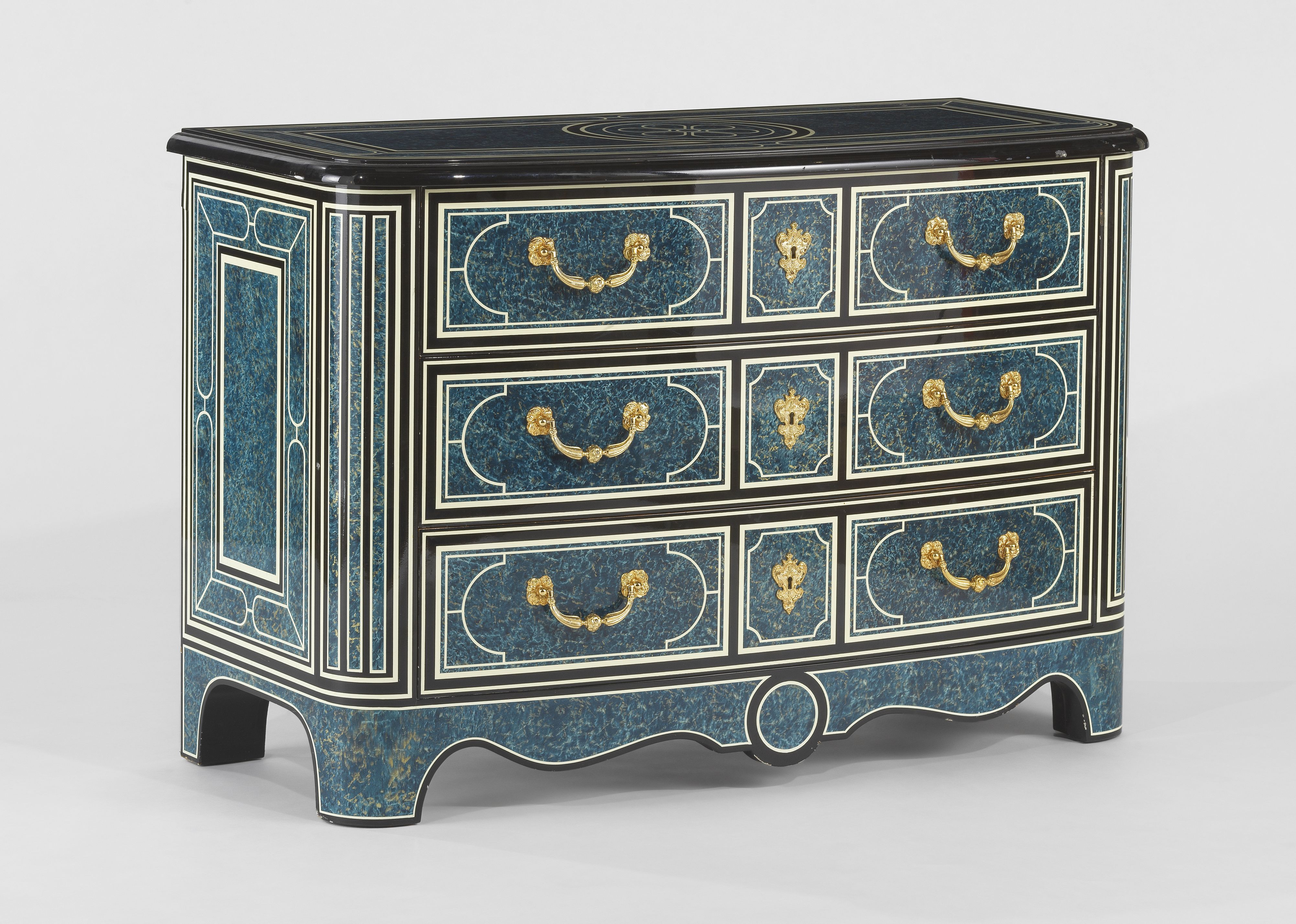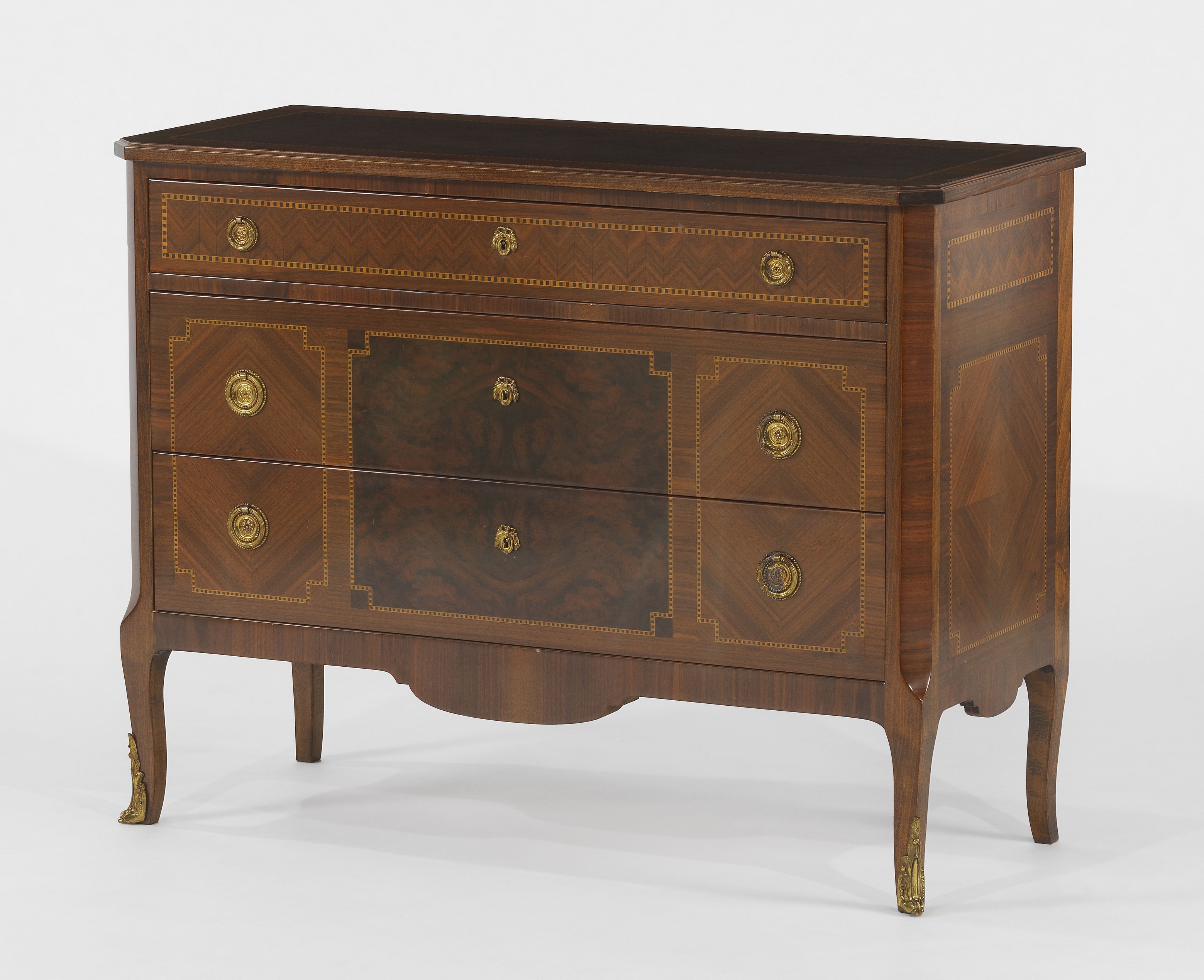 Trois tiroirs, bronze doré, plaquage de bois à motifs géométriqu...