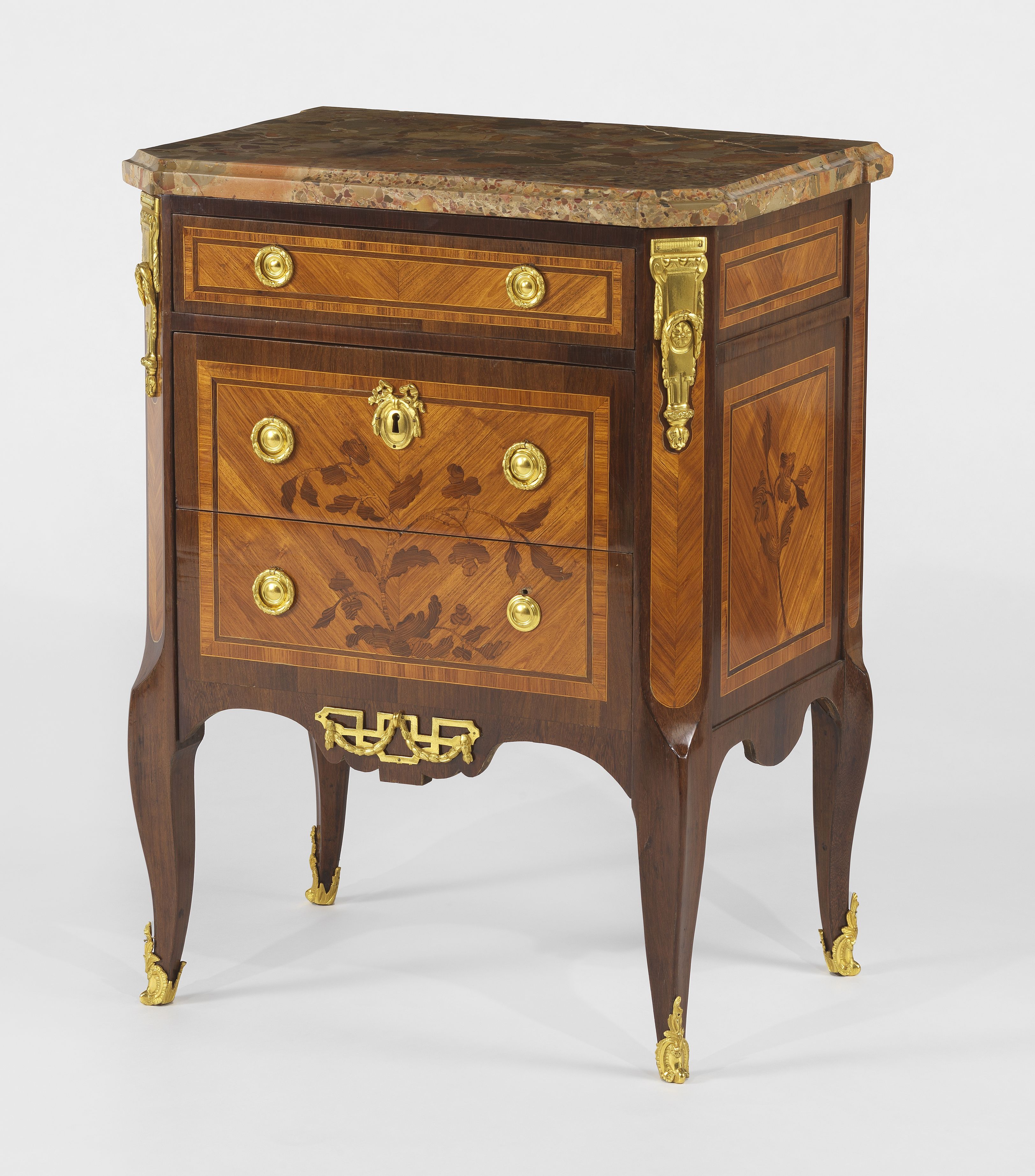 Trois tiroirs, bronze doré, marqueterie de bois de rose et viole...