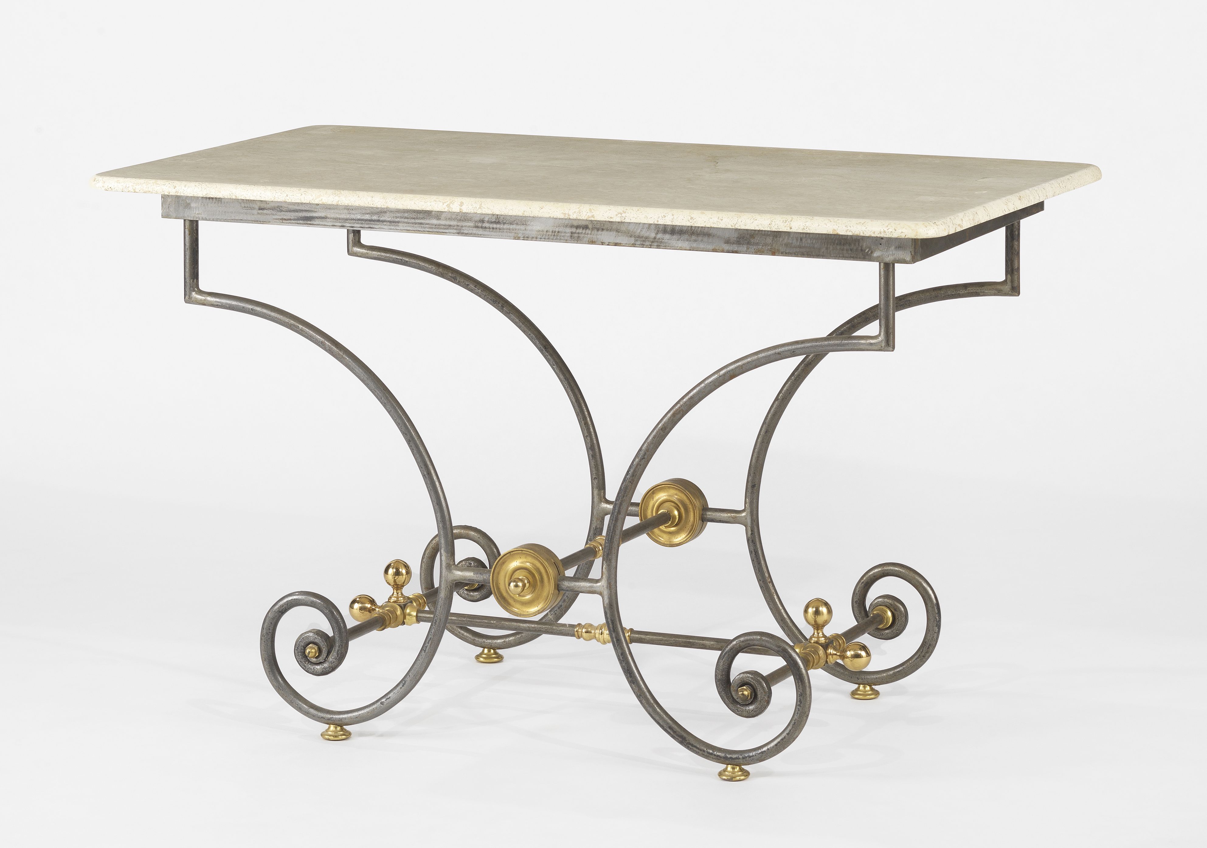 Fer forgé, laiton et travertin, 75120x64 cm